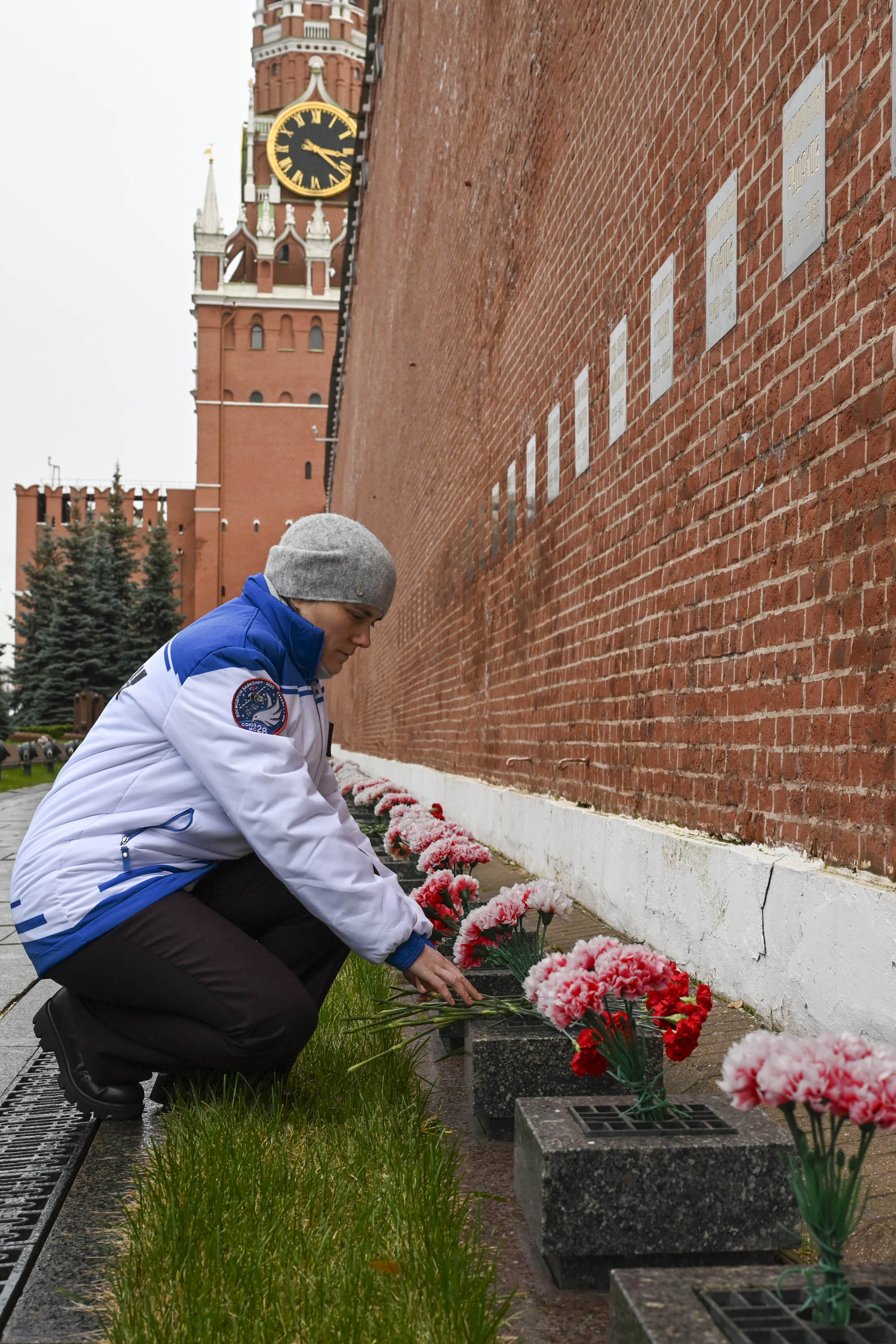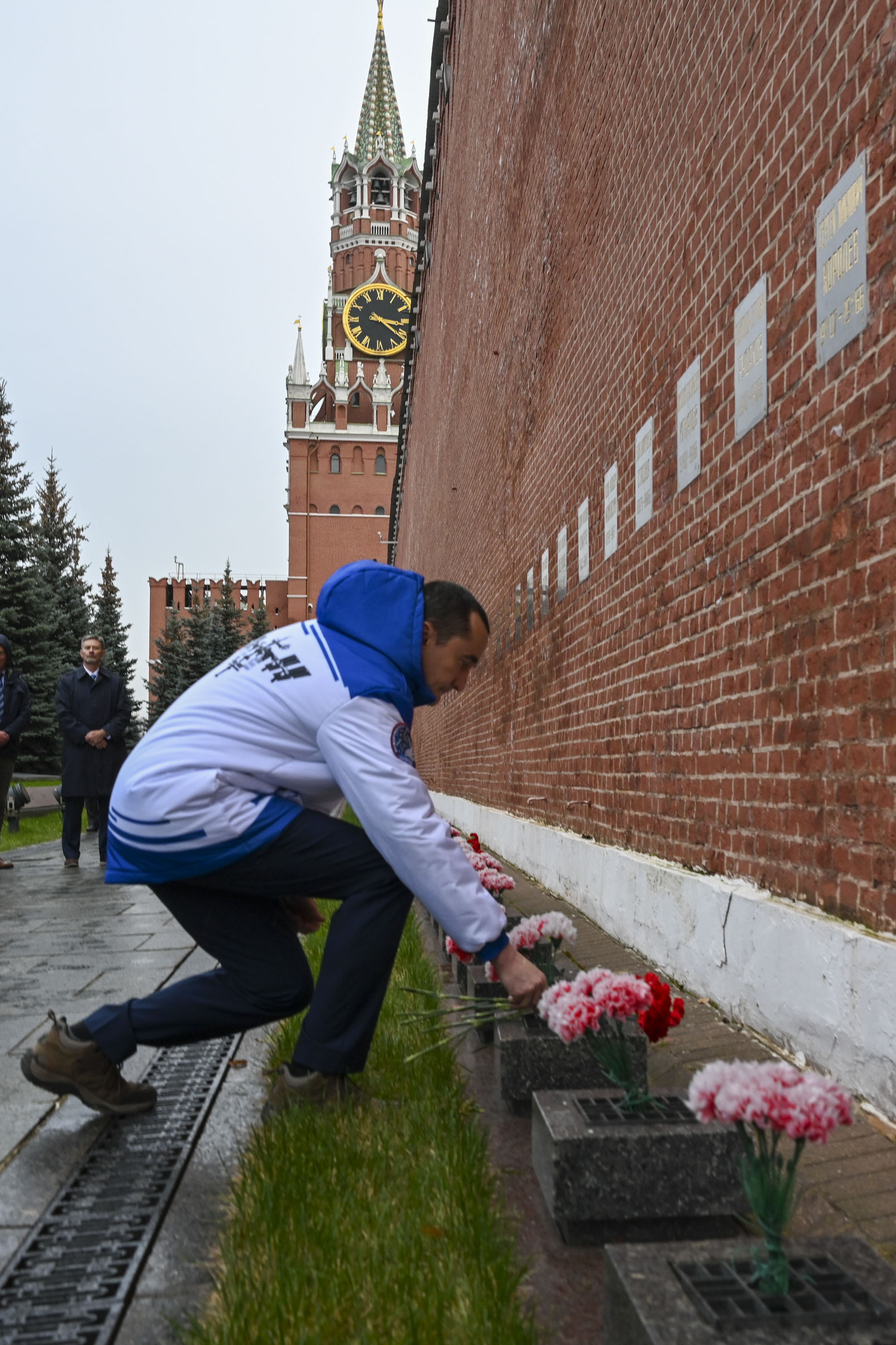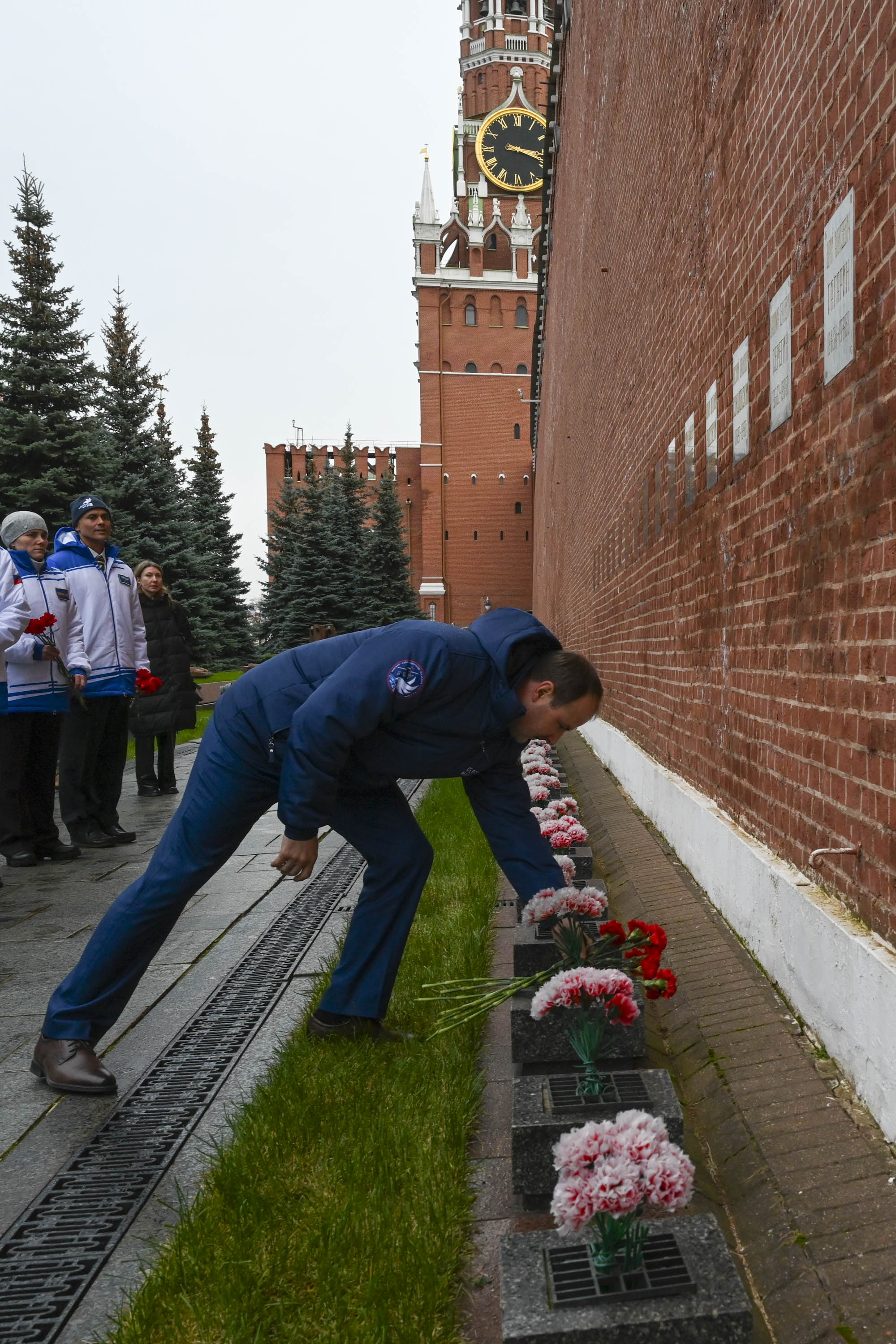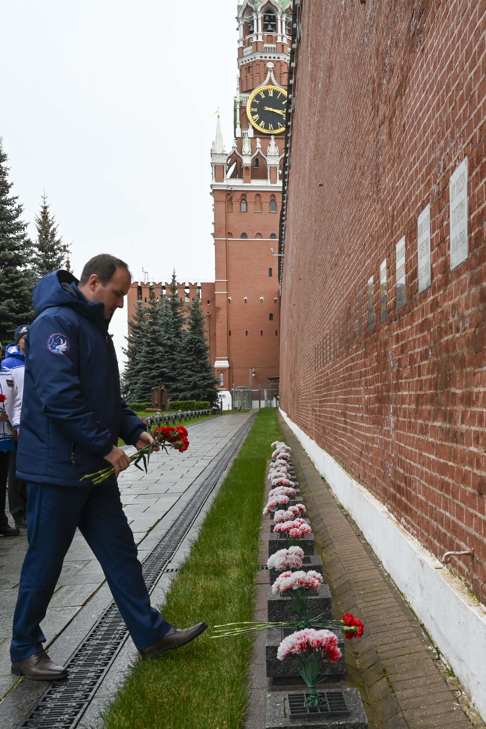 Далее основной и дублирующий экипажи, а также сопровождающие их работники ракетно-космической отрасли отправились в Москву. Делегация возложила цветы и почтила память Сергея Королёва, Юрия Гагарина и космонавтов, захороненных в некрополе у Кремлевской стены.