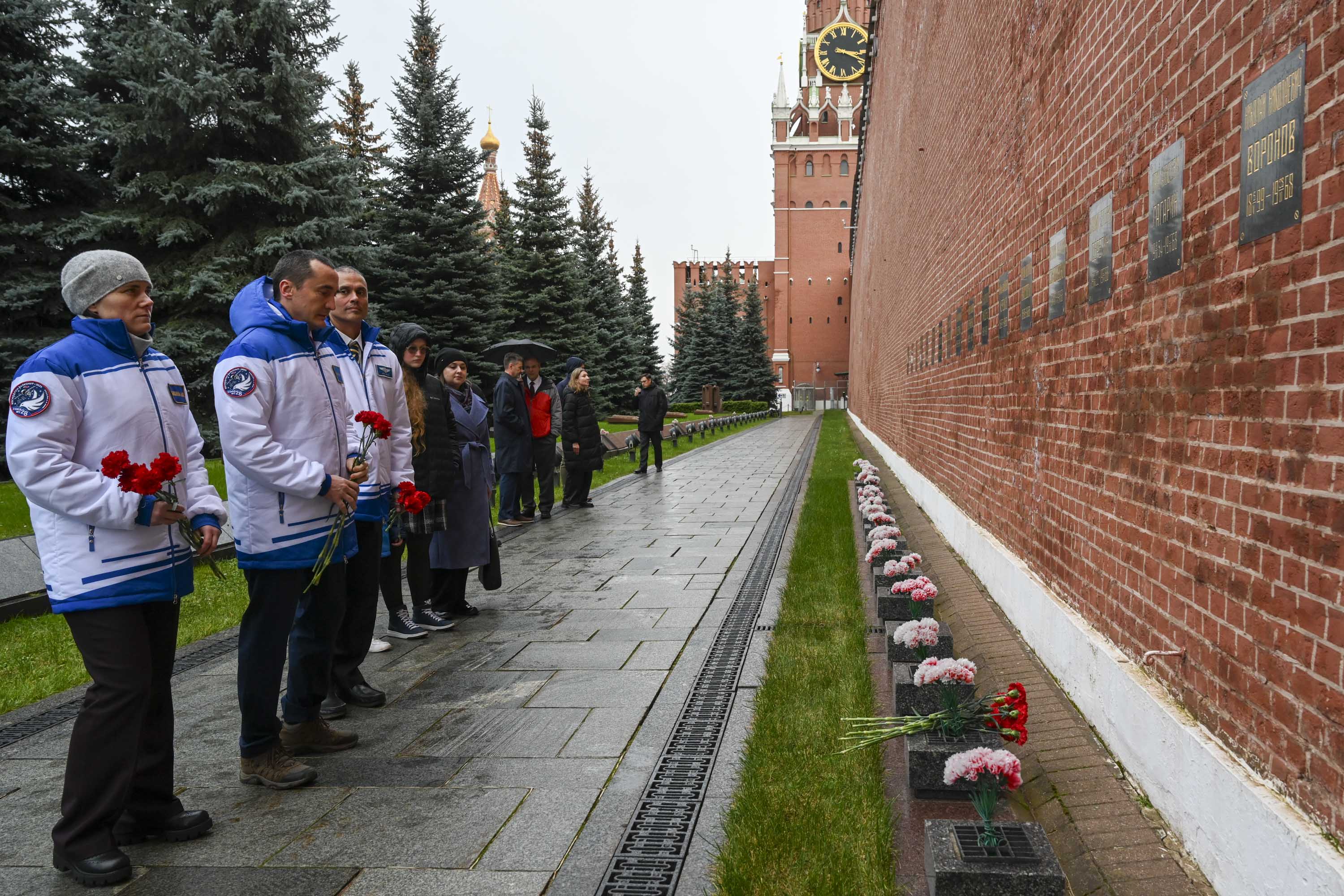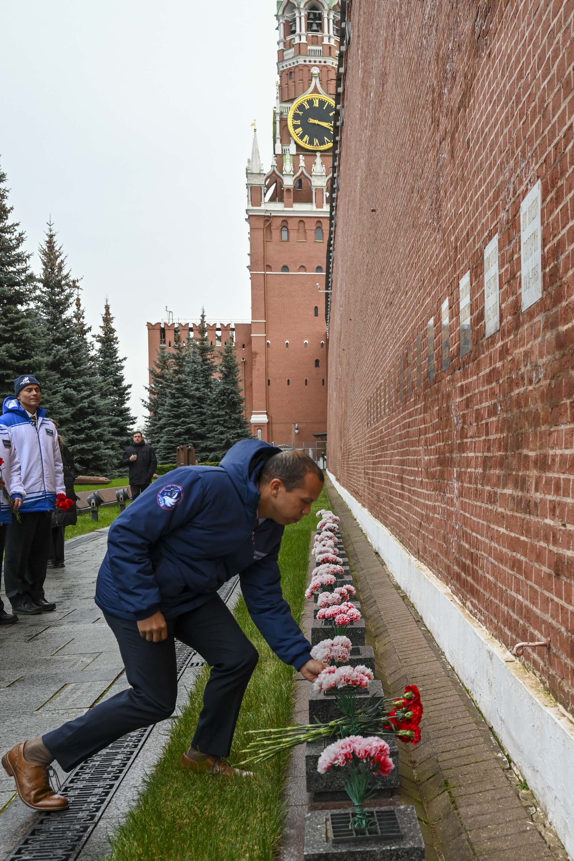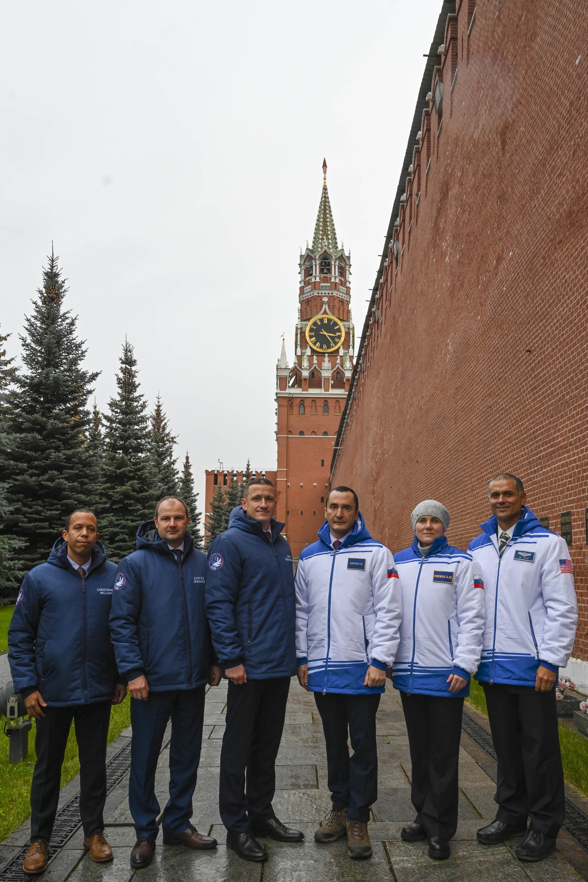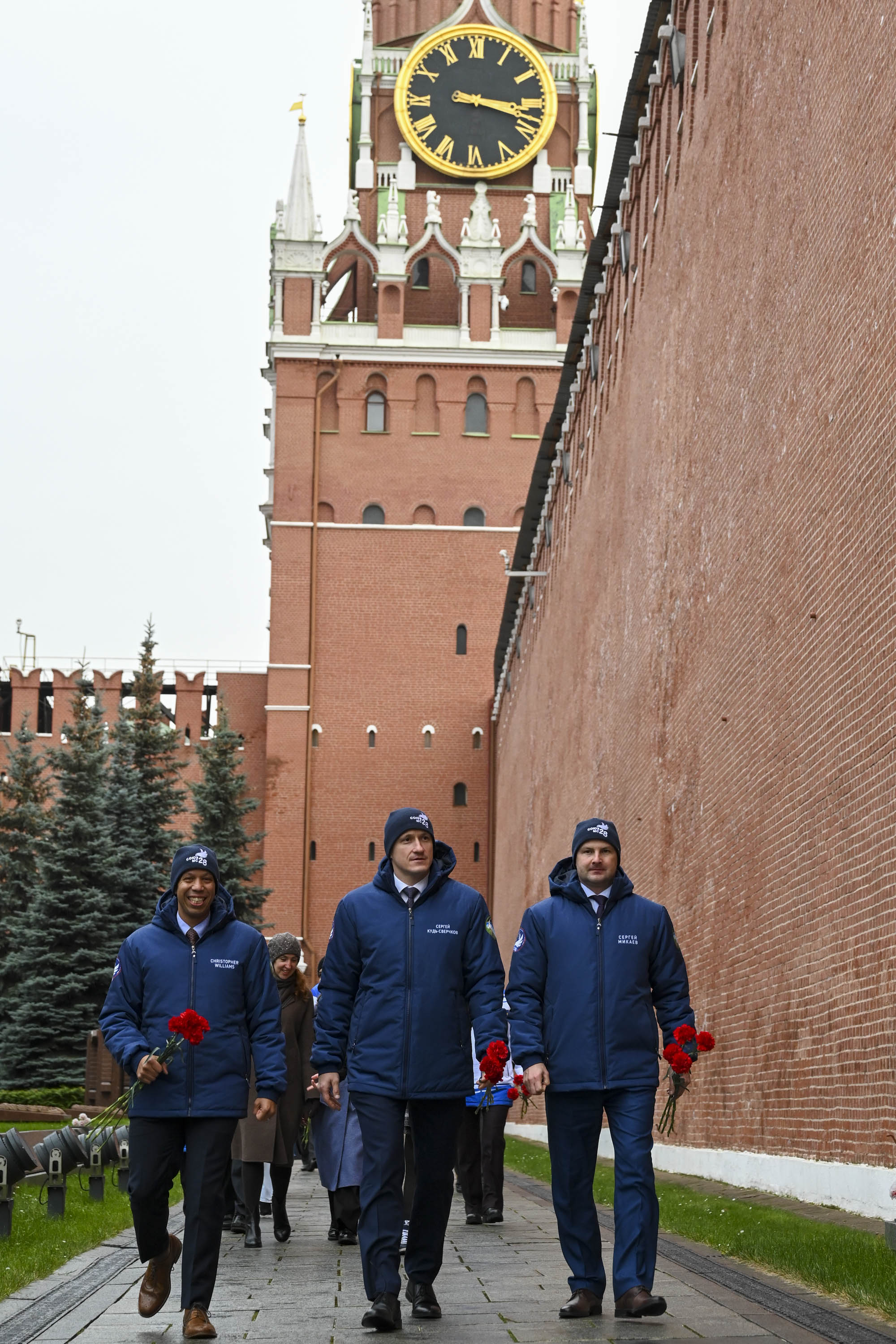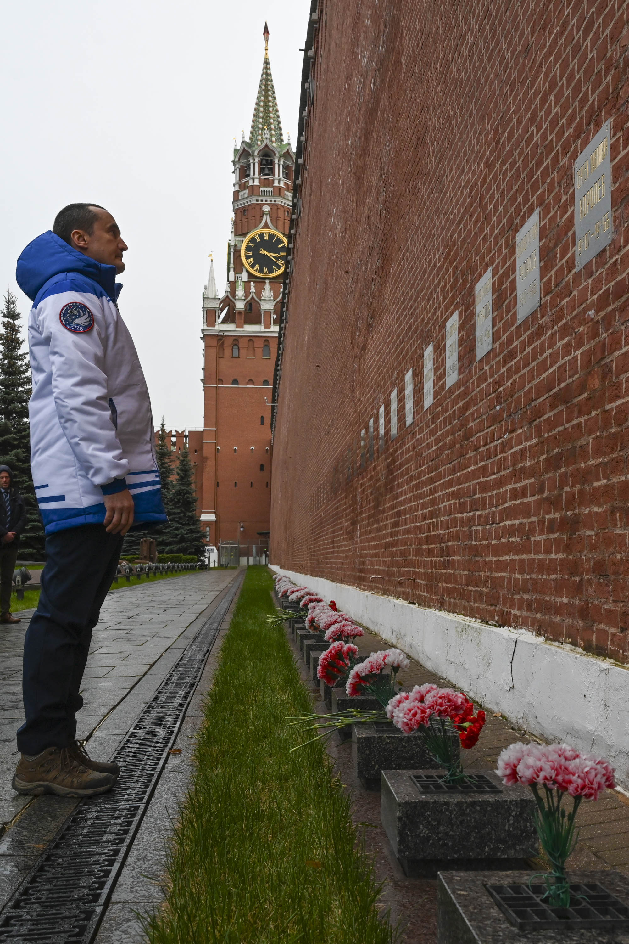 Далее основной и дублирующий экипажи, а также сопровождающие их работники ракетно-космической отрасли отправились в Москву. Делегация возложила цветы и почтила память Сергея Королёва, Юрия Гагарина и космонавтов, захороненных в некрополе у Кремлевской стены.