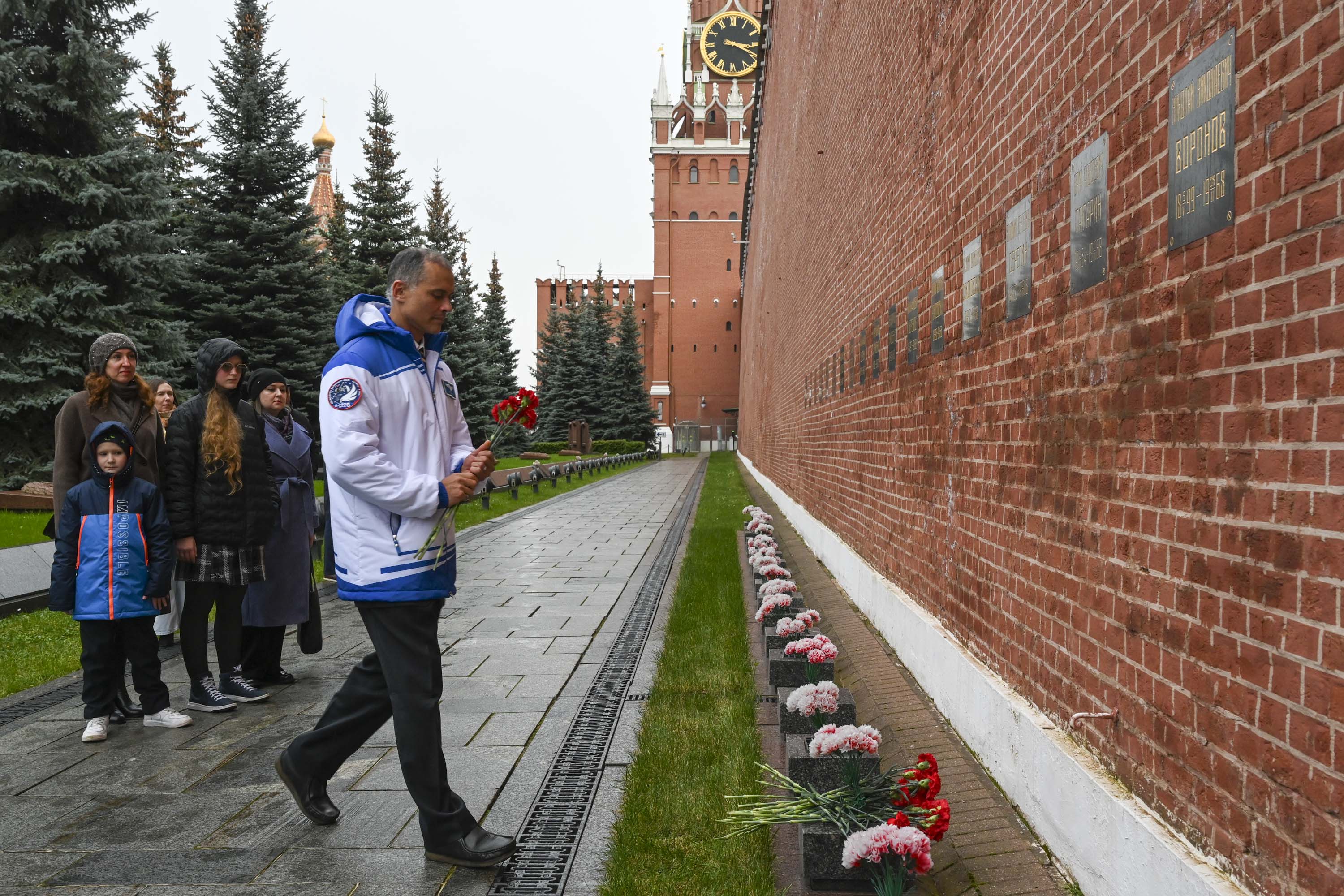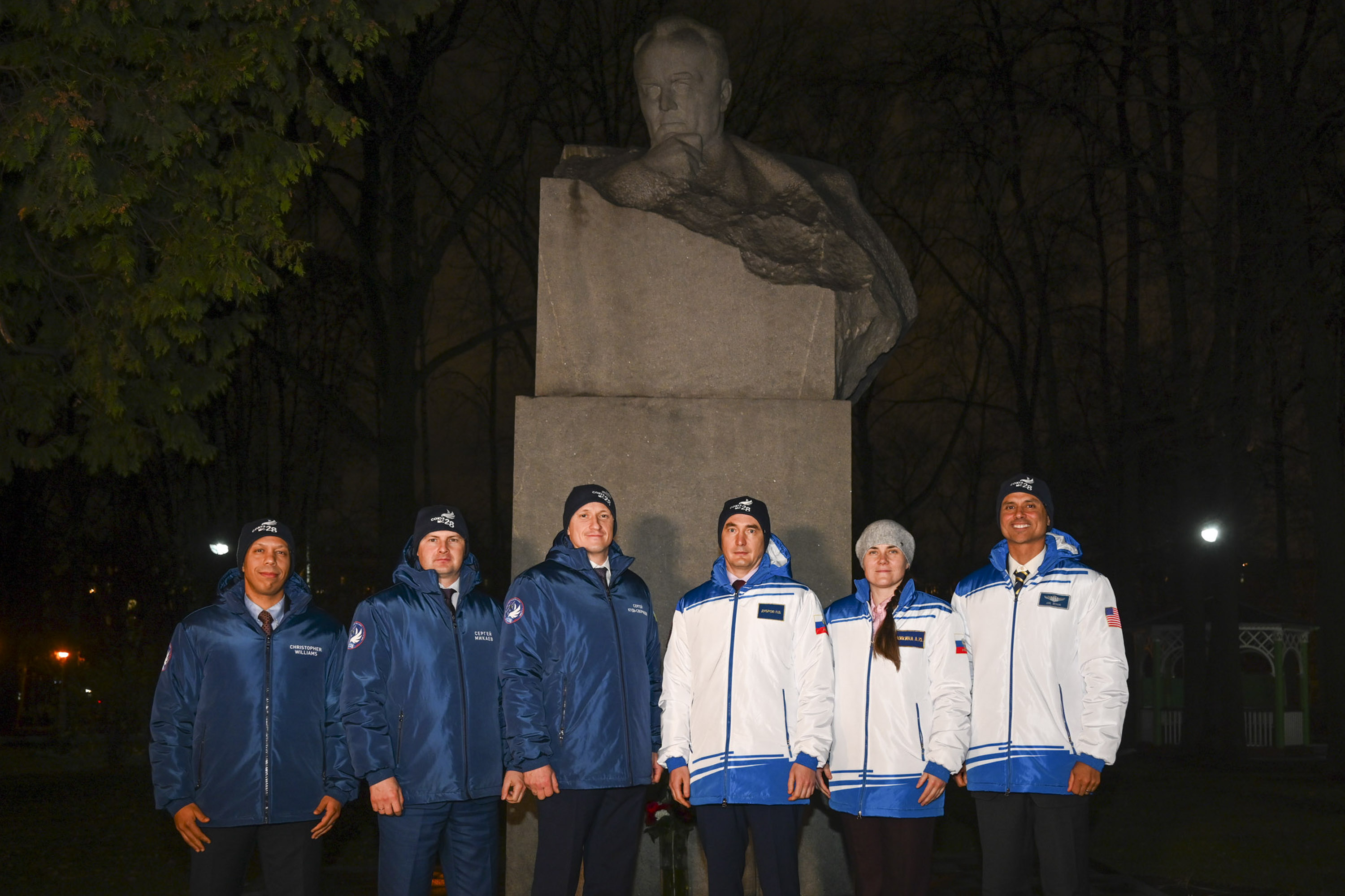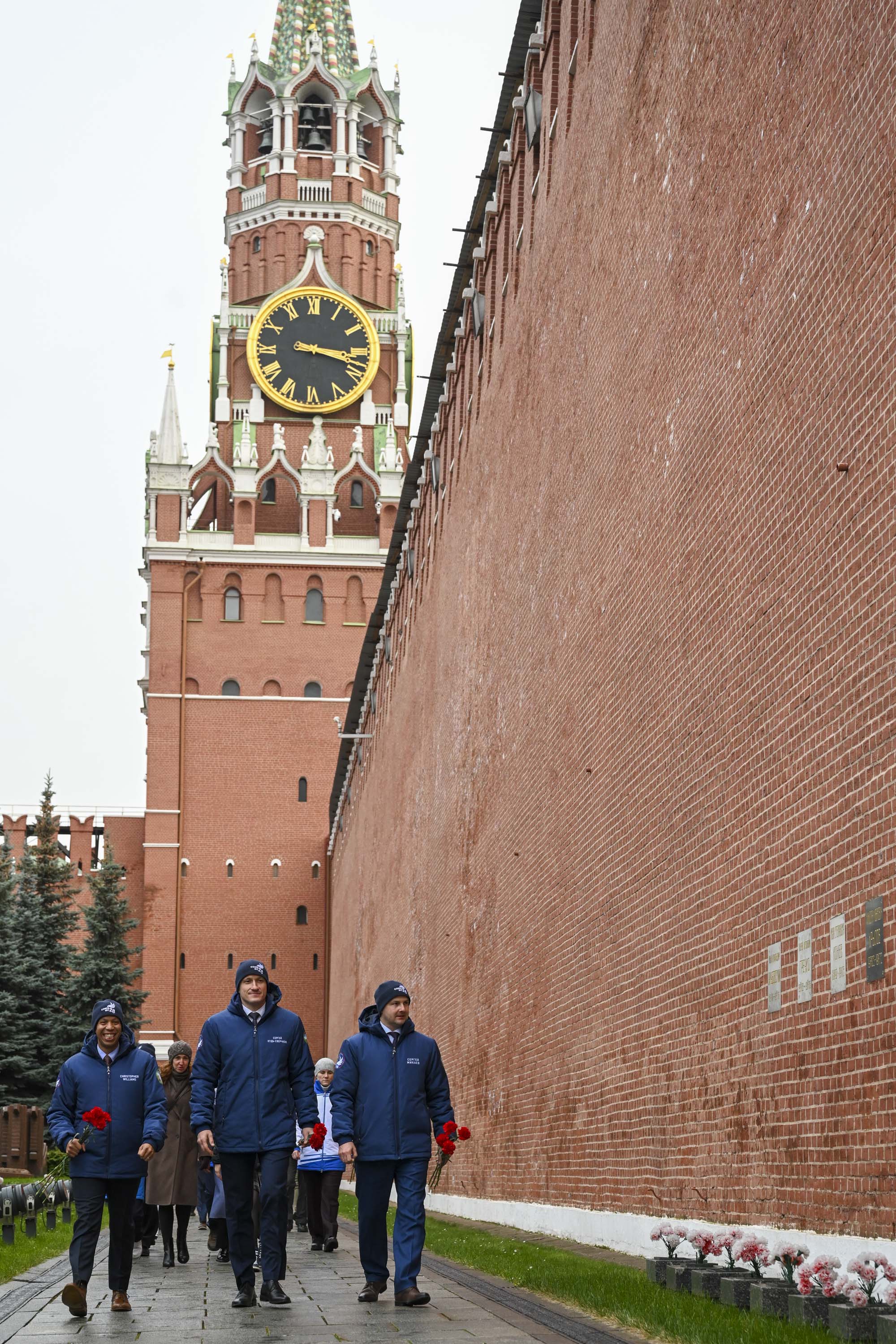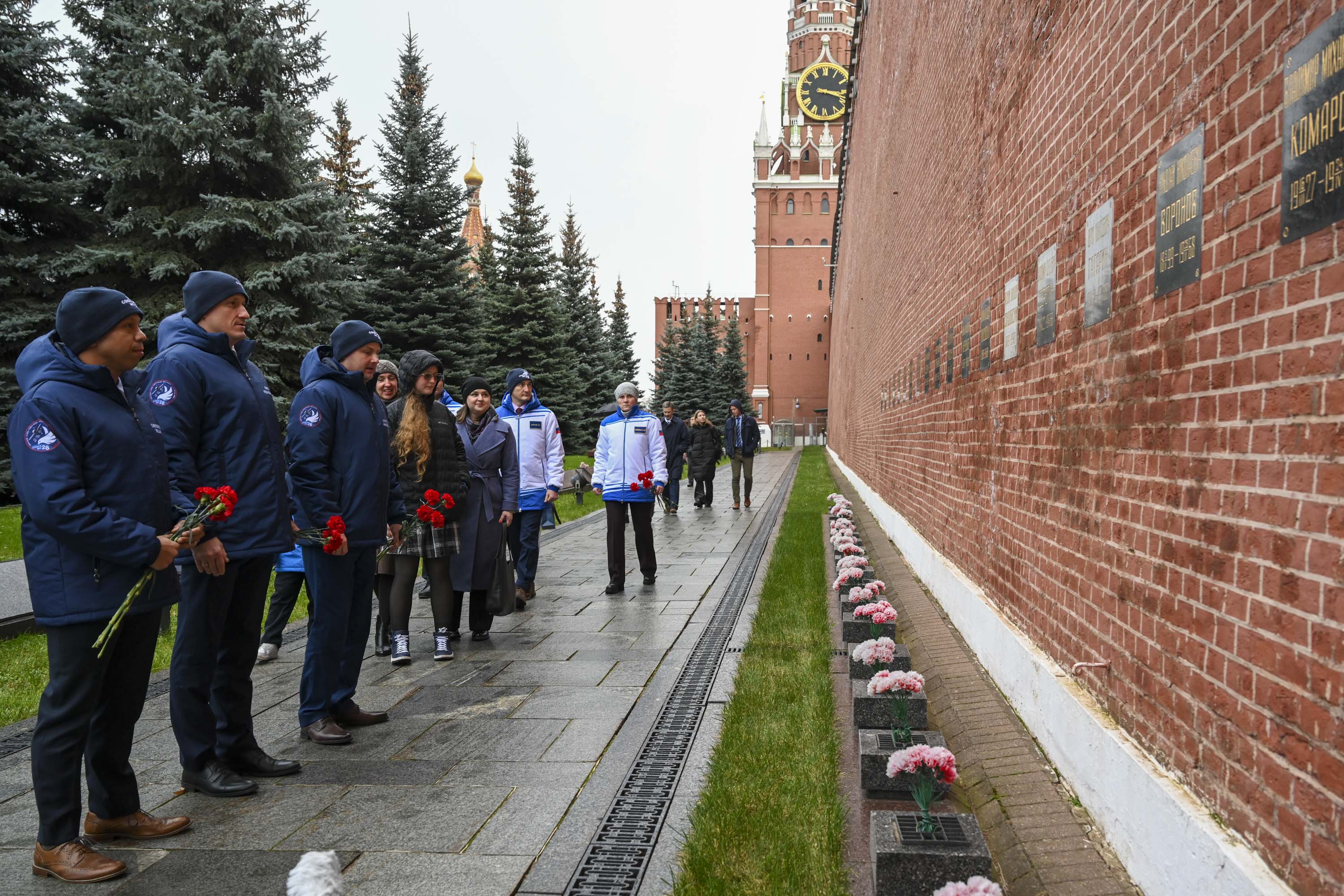 Далее основной и дублирующий экипажи, а также сопровождающие их работники ракетно-космической отрасли отправились в Москву. Делегация возложила цветы и почтила память Сергея Королёва, Юрия Гагарина и космонавтов, захороненных в некрополе у Кремлевской стены.