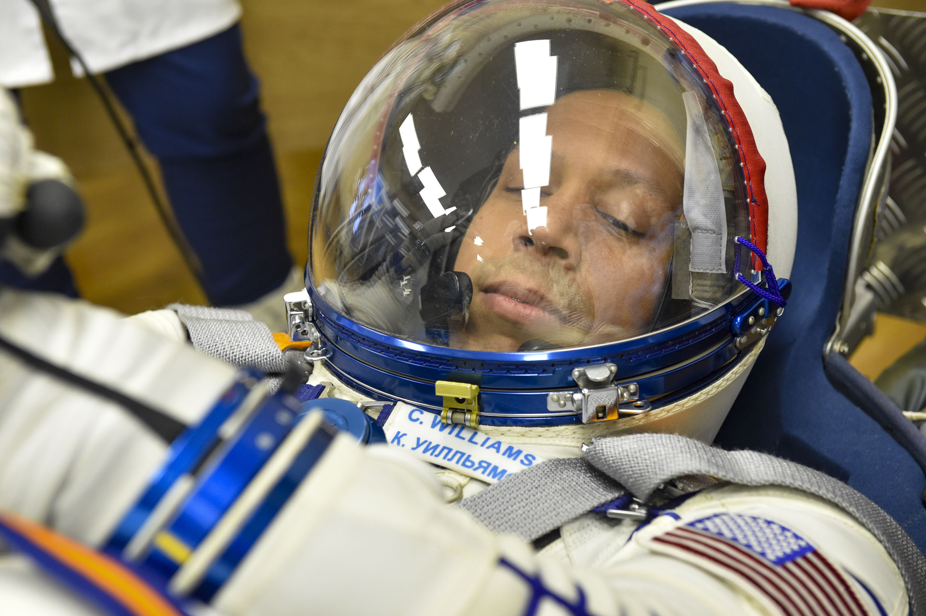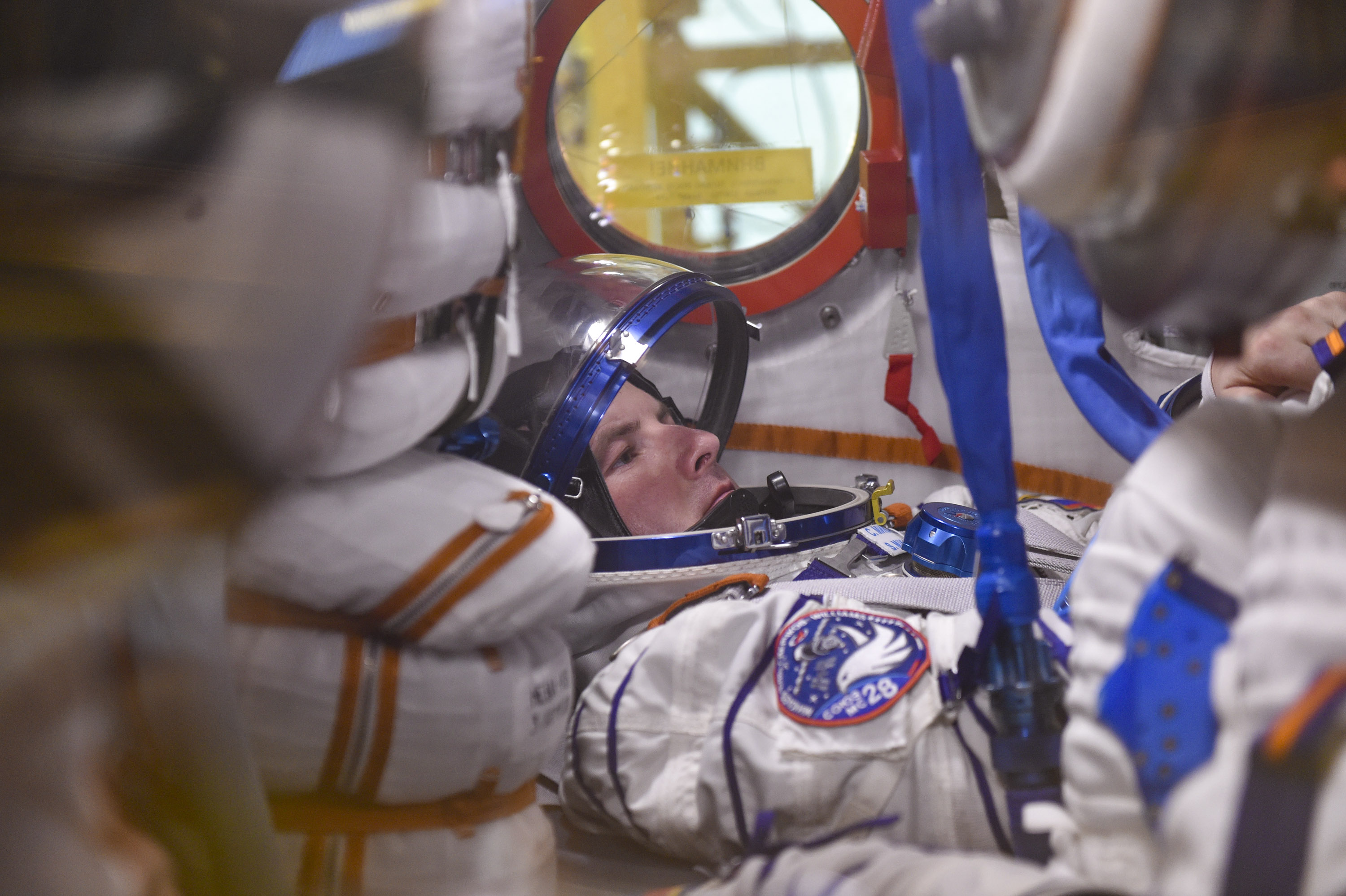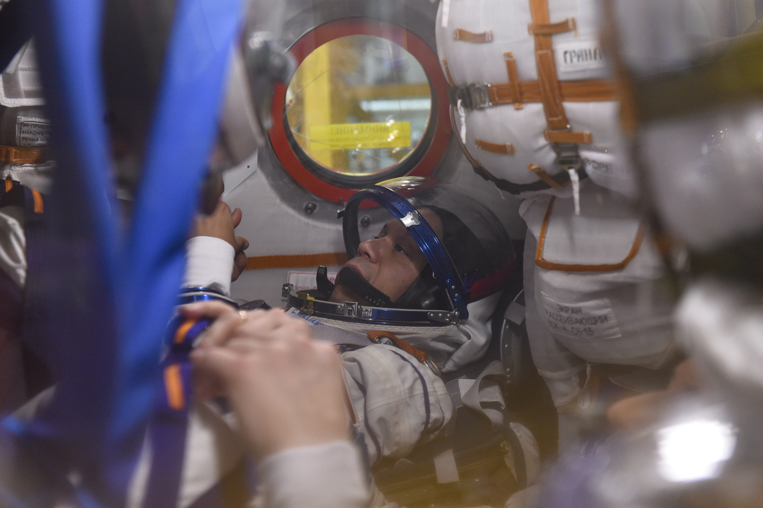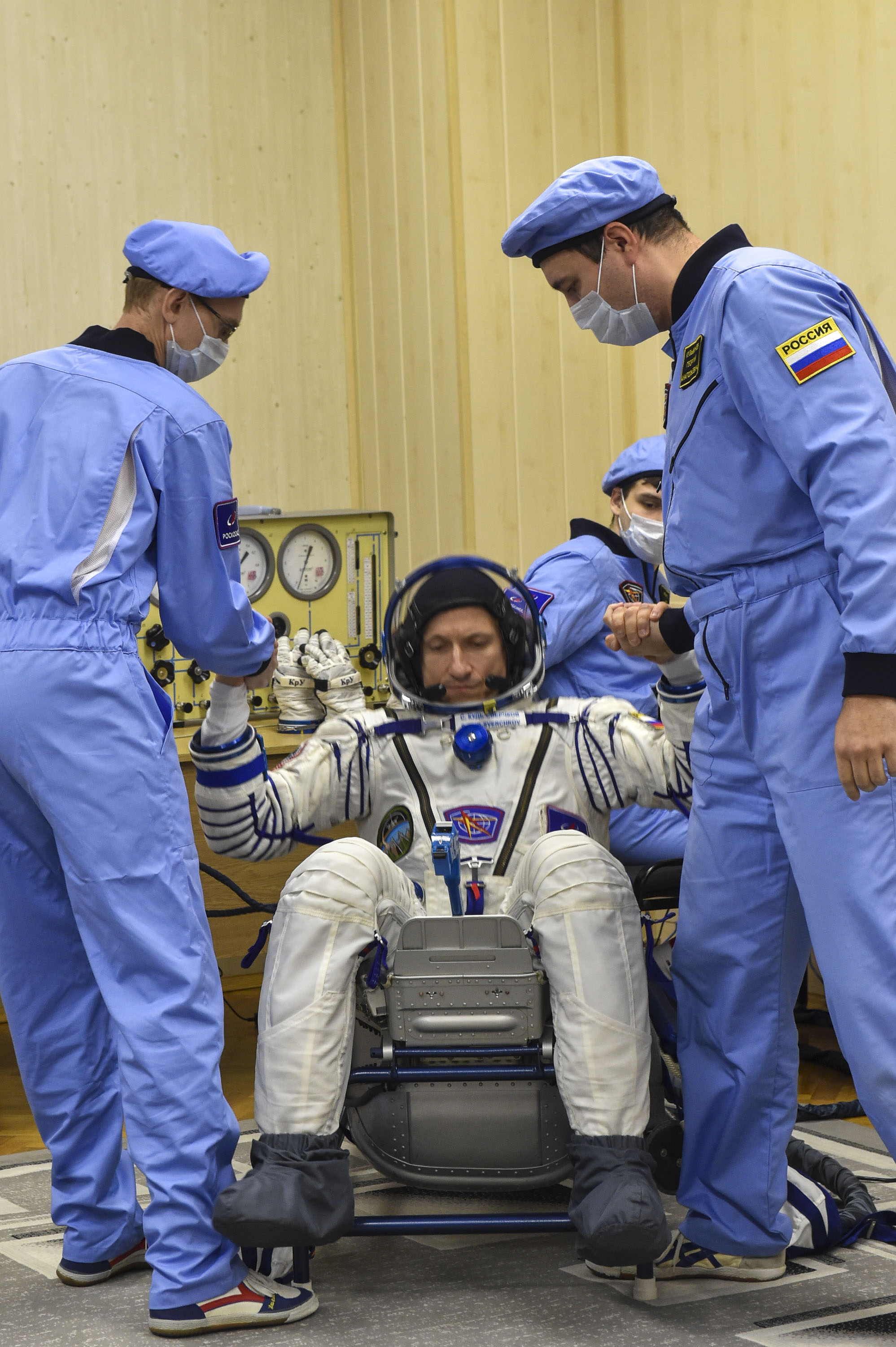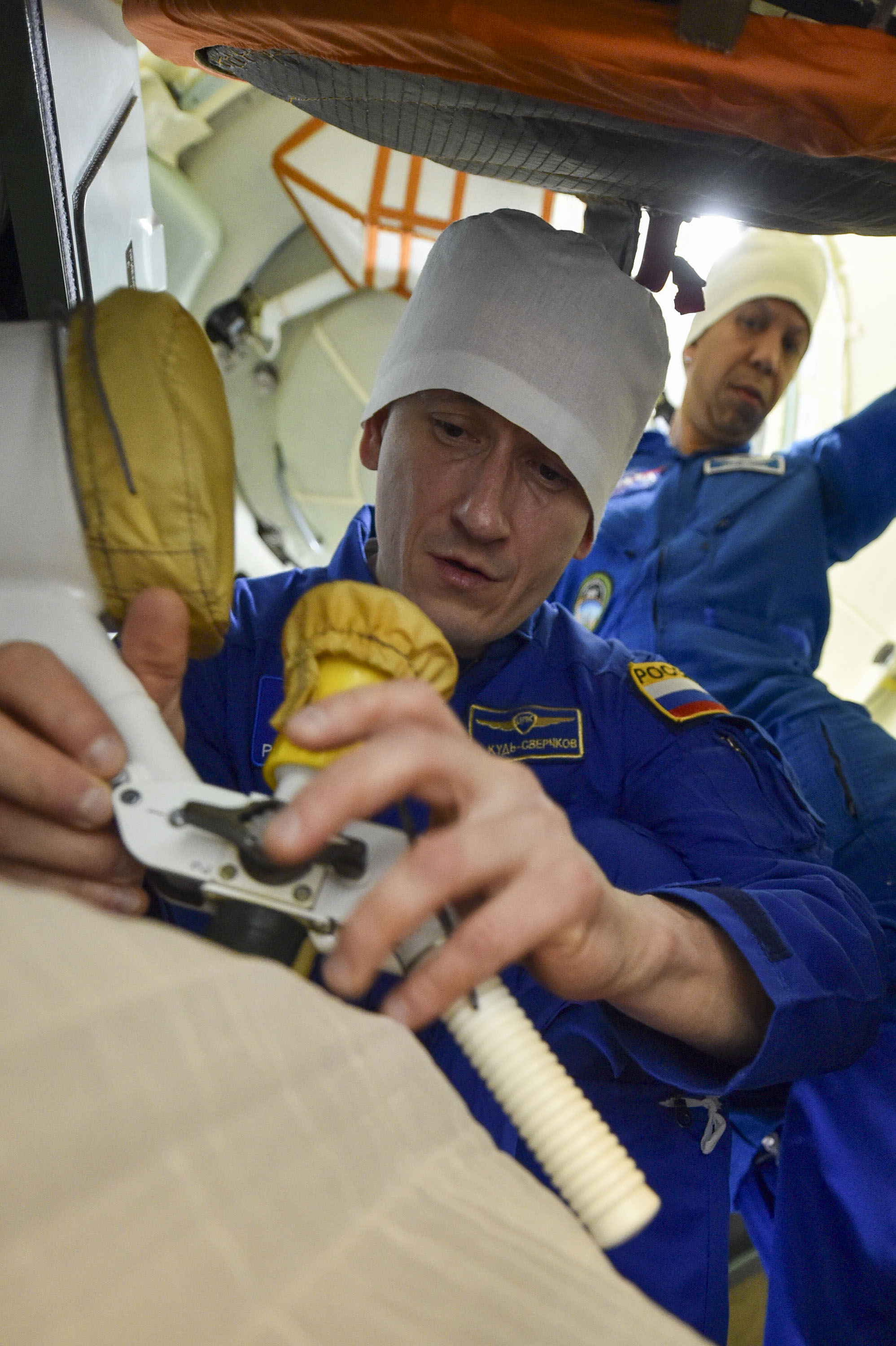 Важная часть первой примерки корабля заключается в работе основного экипажа в скафандрах. Космонавты Сергей Кудь-Сверчков, Сергей Микаев и астронавт Кристофер Уилльямс надели их и проверили на герметичность на специальном стенде, а затем перешли уже в скафандрах в корабль и продолжили там работу. Им было важно убедиться, насколько удобно в них сидеть в ложементах, удобно ли они расположены относительно пульта управления.