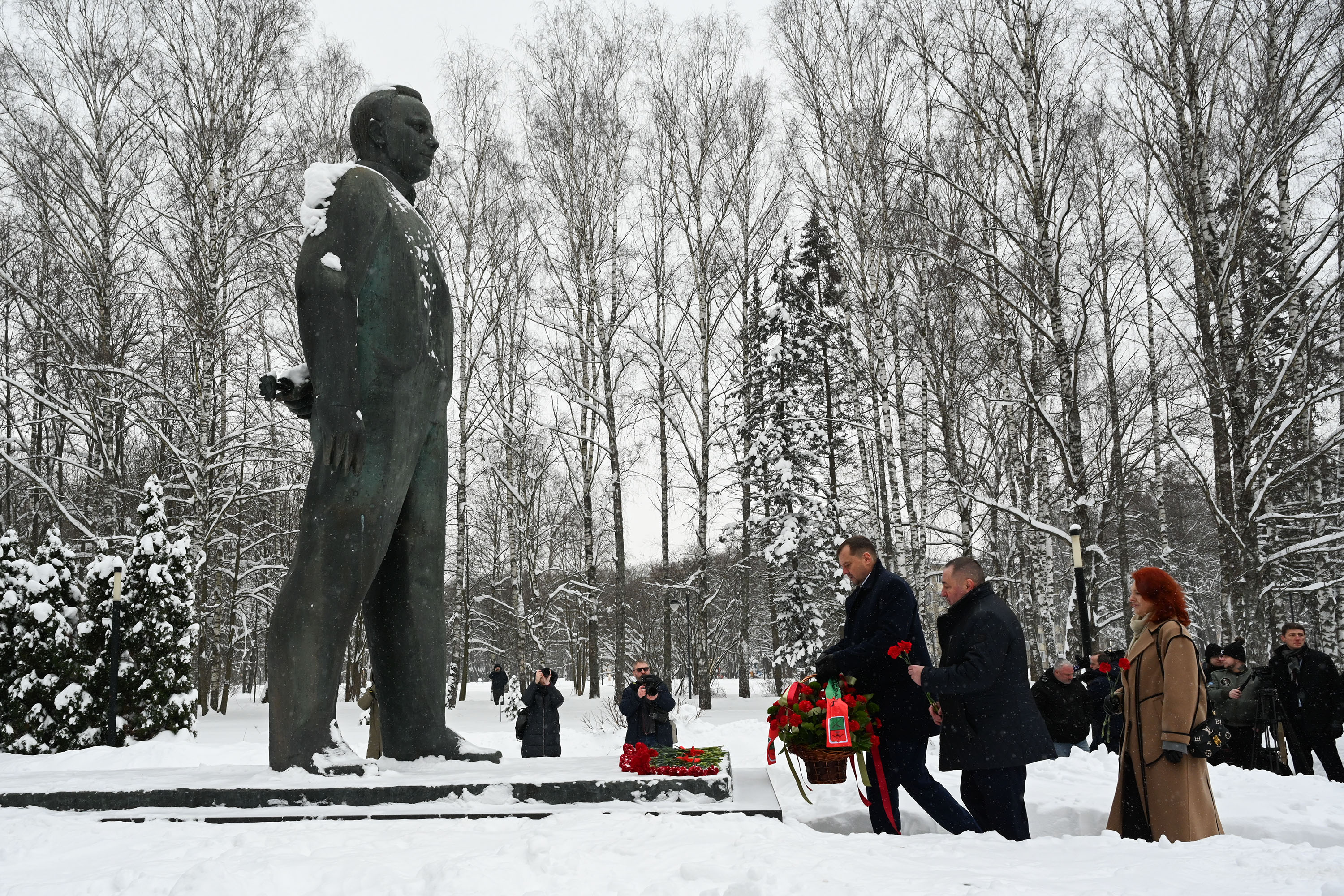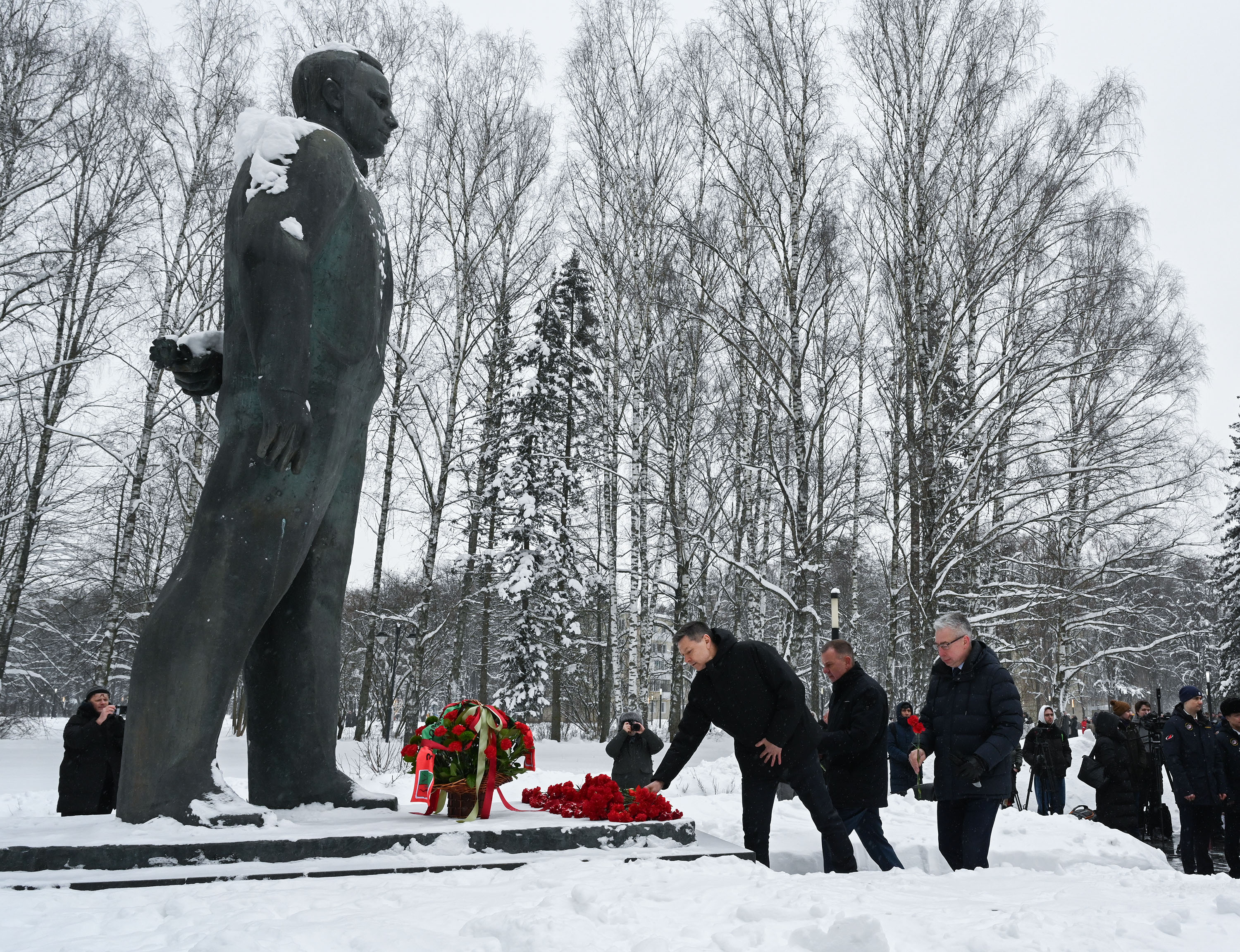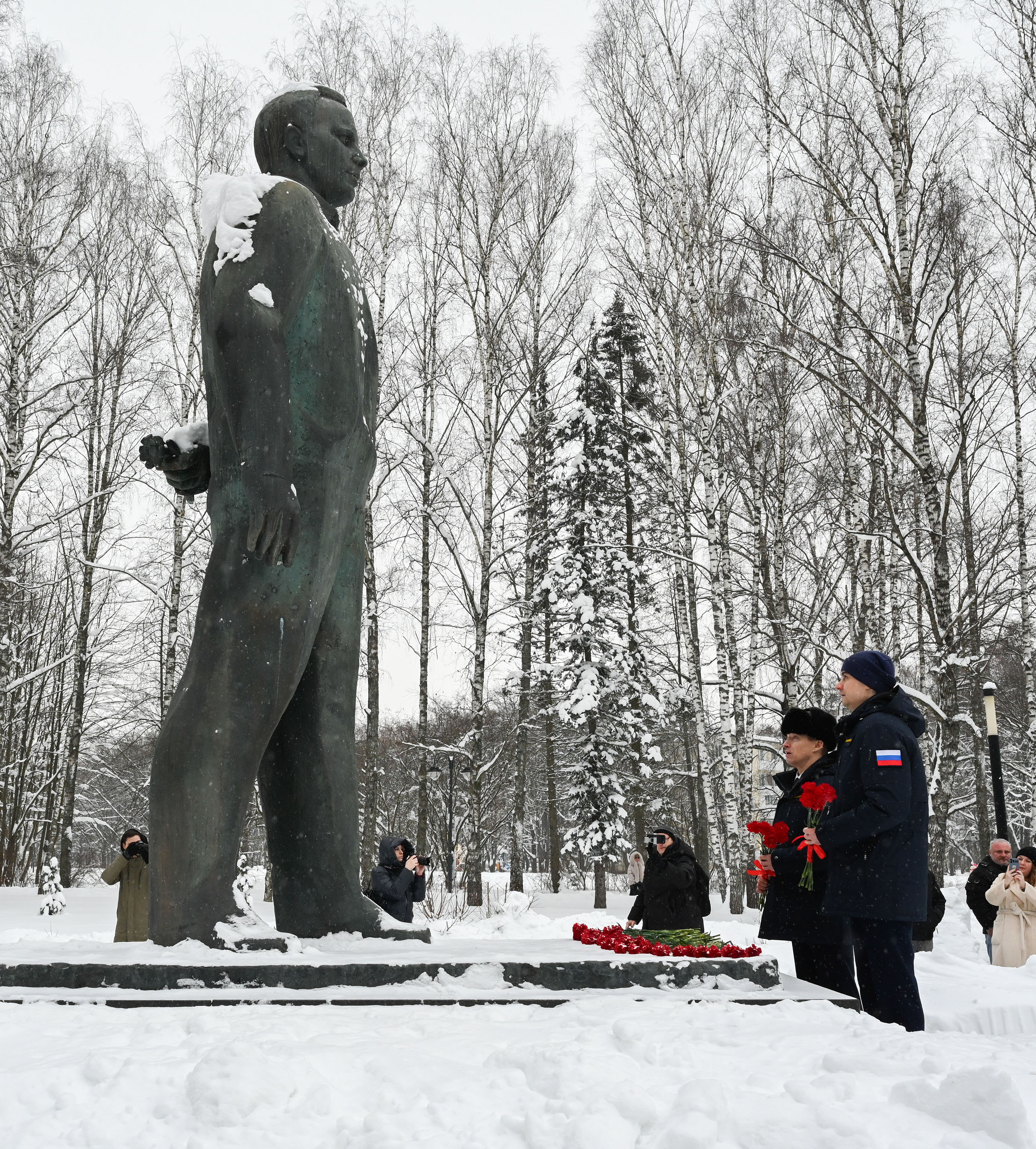 В полдень, следуя традиции, после доклада председателю Государственной комиссии космонавты, руководство, работники ЦПК и ракетно-космических предприятий, а также почётные гости возложили цветы к памятнику Юрию Гагарину.