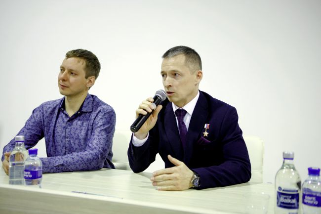 После экскурсии по хранилищу космонавты пообщались с аудиторией. На встречу с героями пришли ученики столичных и подмосковных школ, студенты колледжа Московского государственного педагогического университета и представители молодёжного клуба «Красноярского землячества».
