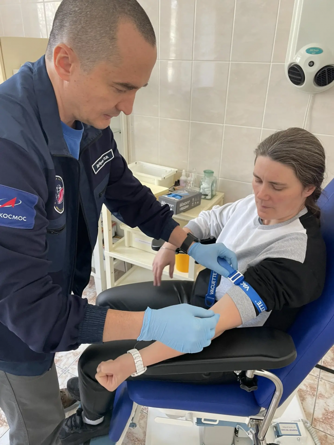 Во время работы на борту МКС космонавтам предстоит брать венозную кровь друг у друга. Эта процедура требует дополнительных знаний и отработки навыков. В ЦПК практические занятия по подготовке к таким экспериментам проходят в клинической лаборатории, с соблюдением правил асептики и антисептики, под контролем медицинских специалистов.