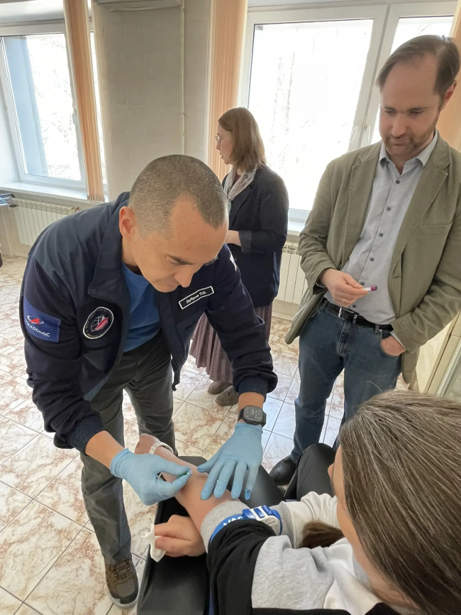 «Используя реальное оборудование (специальные иглы и пробирки), Пётр с первой попытки попал в вену и сумел набрать необходимое количество крови у Анны. Это, пожалуй, самая сложная часть эксперимента, без которой не получится пройти остальные этапы. Космонавты и специалисты остались довольны результатами практического занятия настолько, что попросили провести ещё одно! Мы уверены, что в космосе экипажу будет гораздо легче справиться с этой процедурой», – рассказала преподаватель ЦПК Наталья Пекарская.