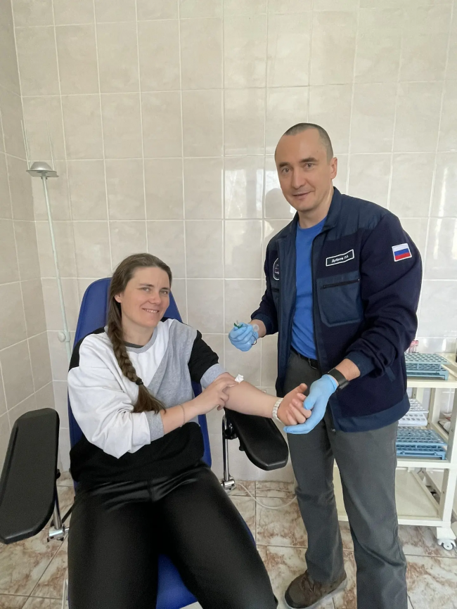 На орбите космонавтам также предстоит заниматься обработкой крови, чтобы сохранить образцы до спуска на Землю: готовить мазки крови на стёклах и центрифугировать шприцы-пробирки для разделения крови на фракции и замораживать их. Во время космического полёта продолжительностью 6 месяцев предусмотрено 3 таких процедуры с забором венозной крови.
