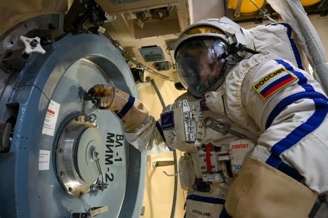 Прежде всего, операторы заходят в скафандры и проверяют их на герметичность. Затем они проверяют изолированный от остального пространства станции шлюзовой отсек.