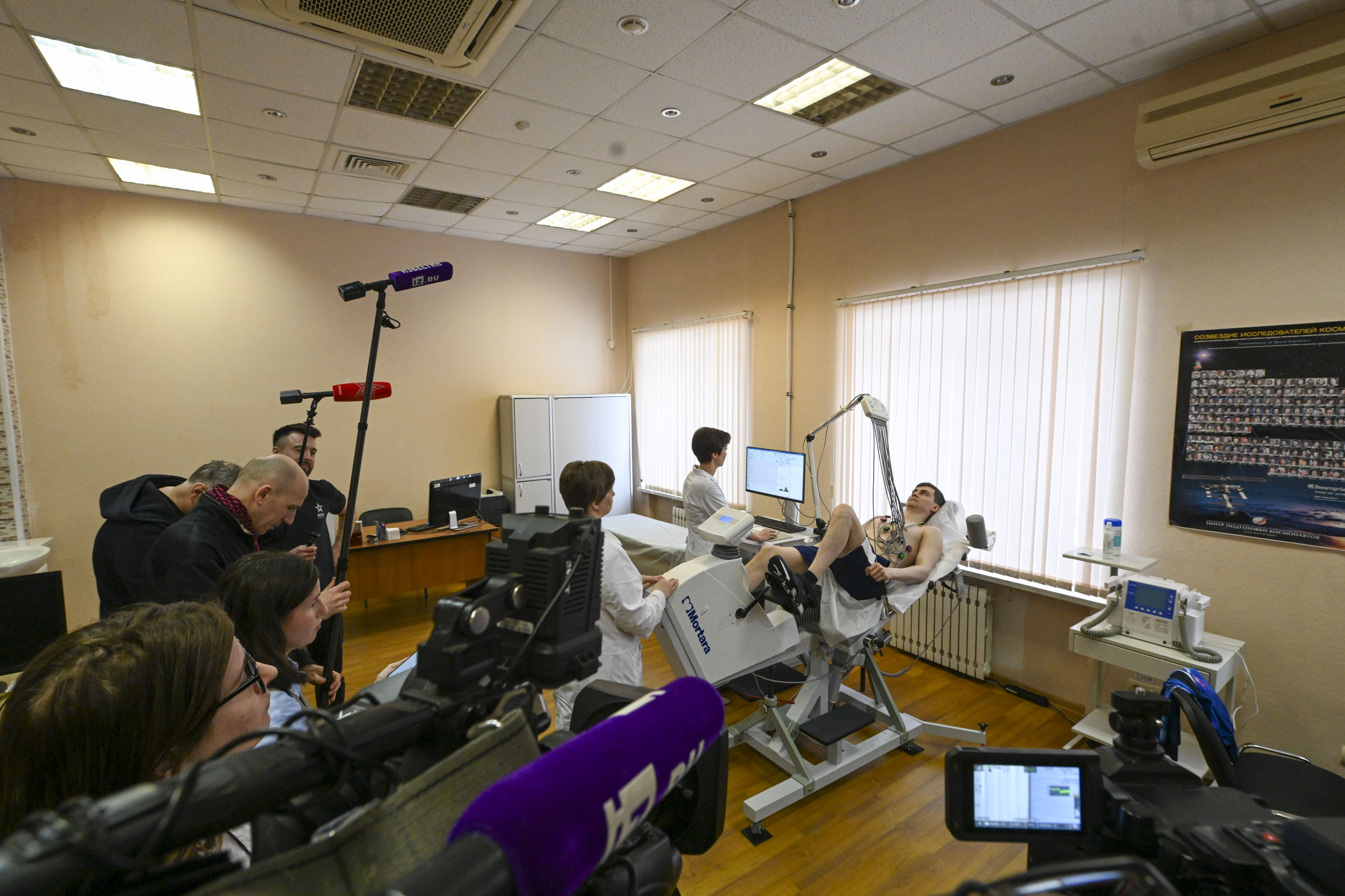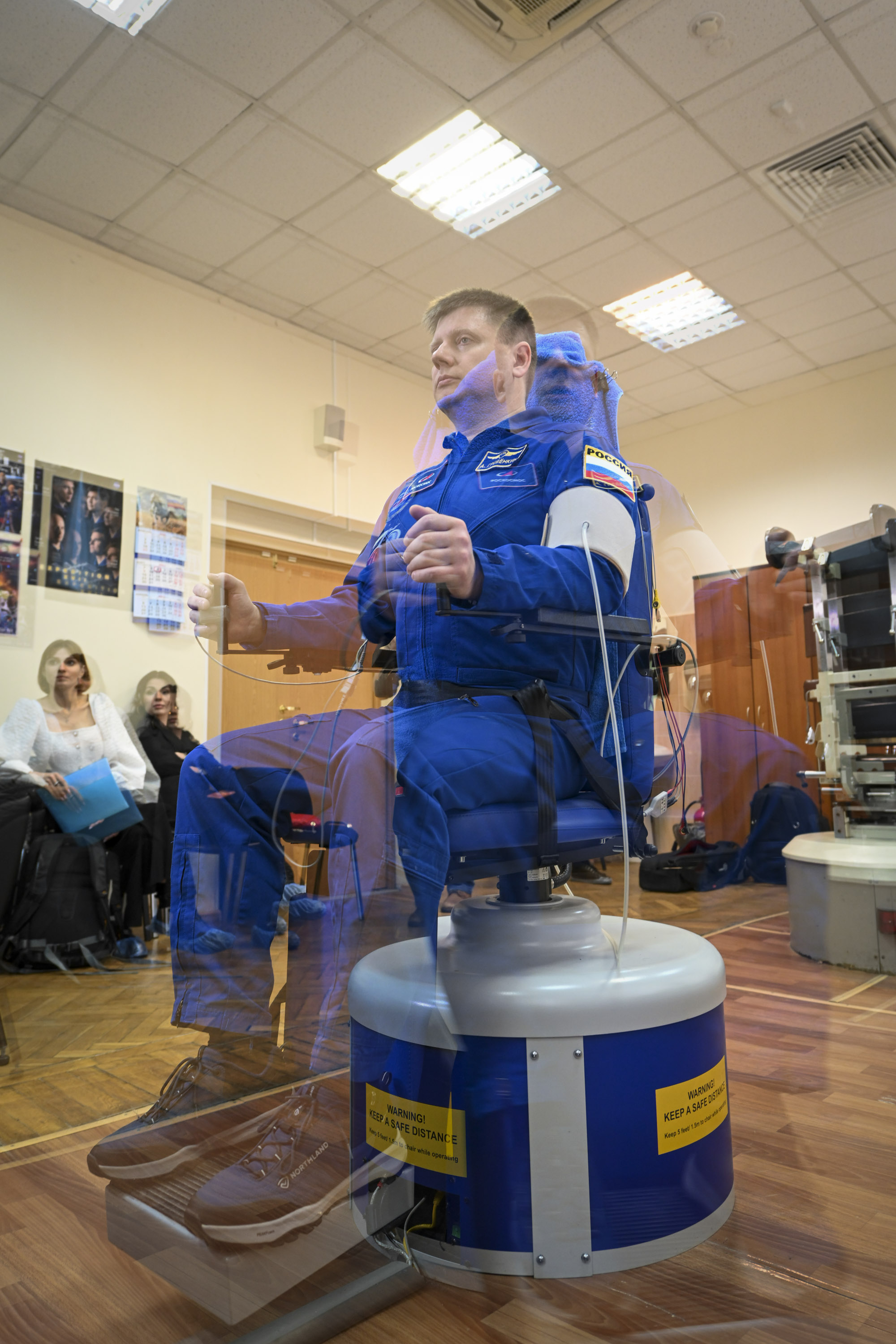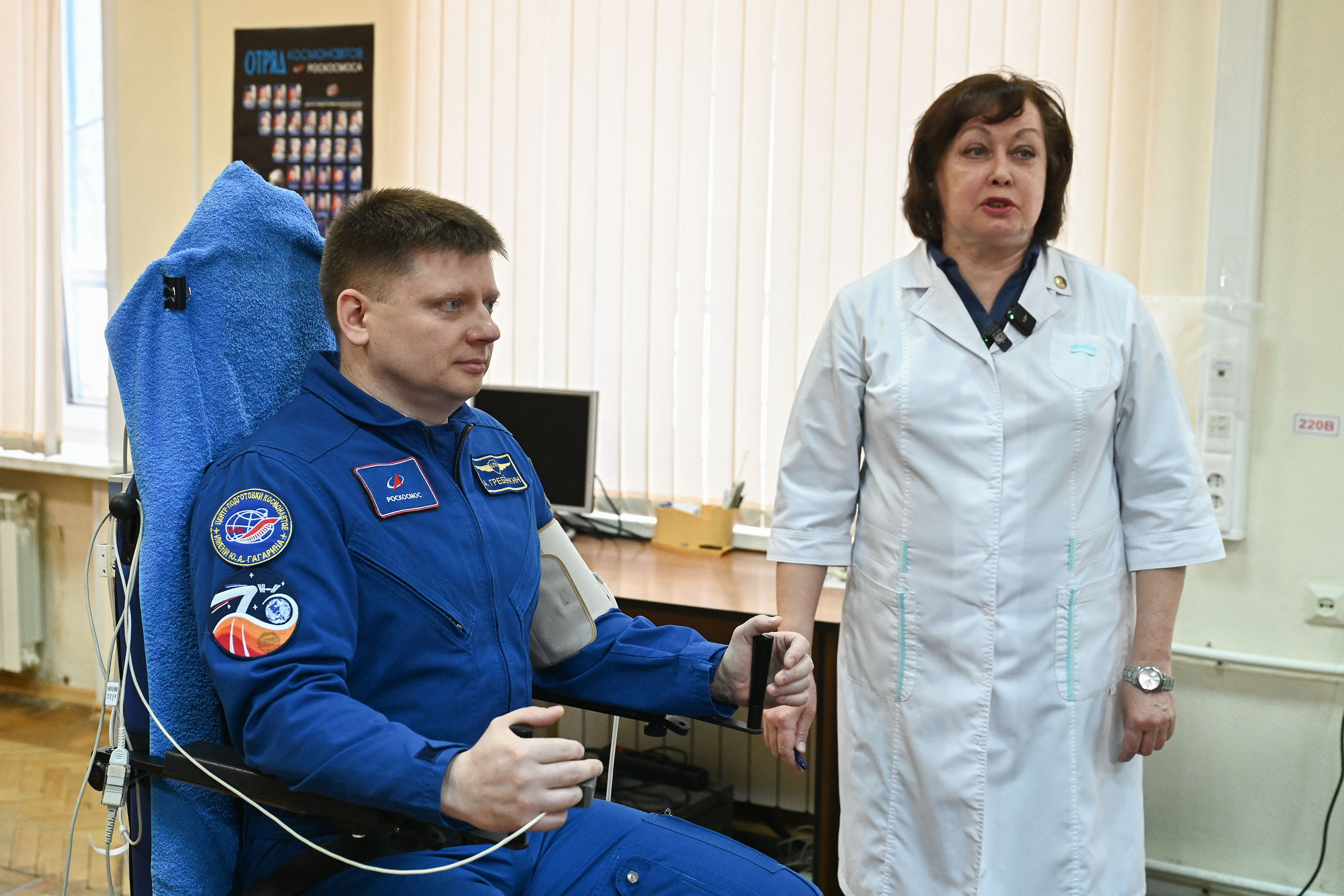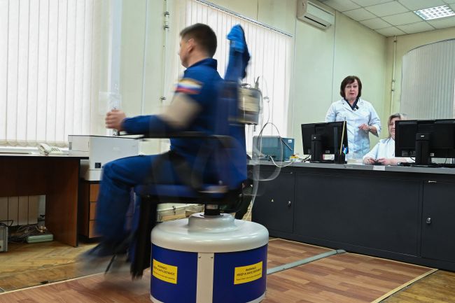 Космонавт Александр Гребёнкин несколько раз продемонстрировал, как проходит исследование на кресле ускорения Кориолиса, а врач функциональной диагностики ЦПК Ирина Коновалова рассказала подробности.