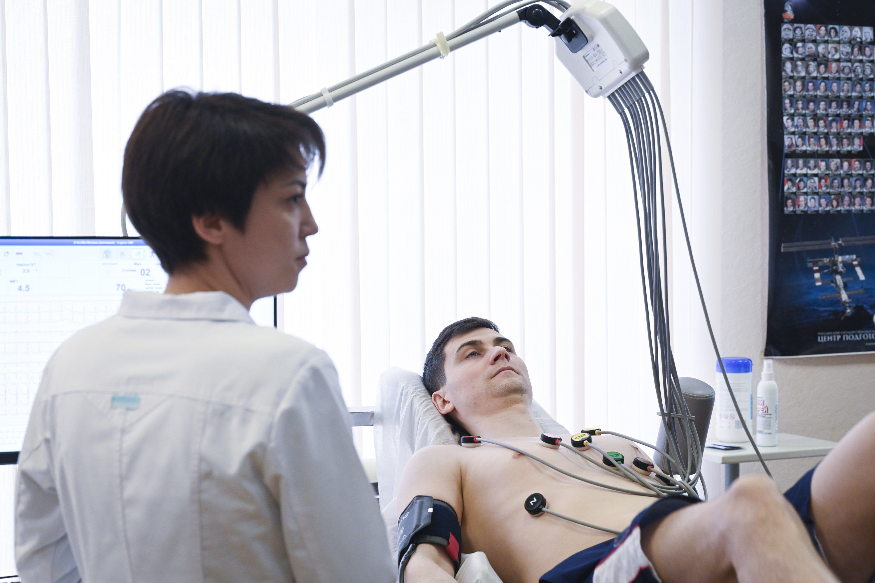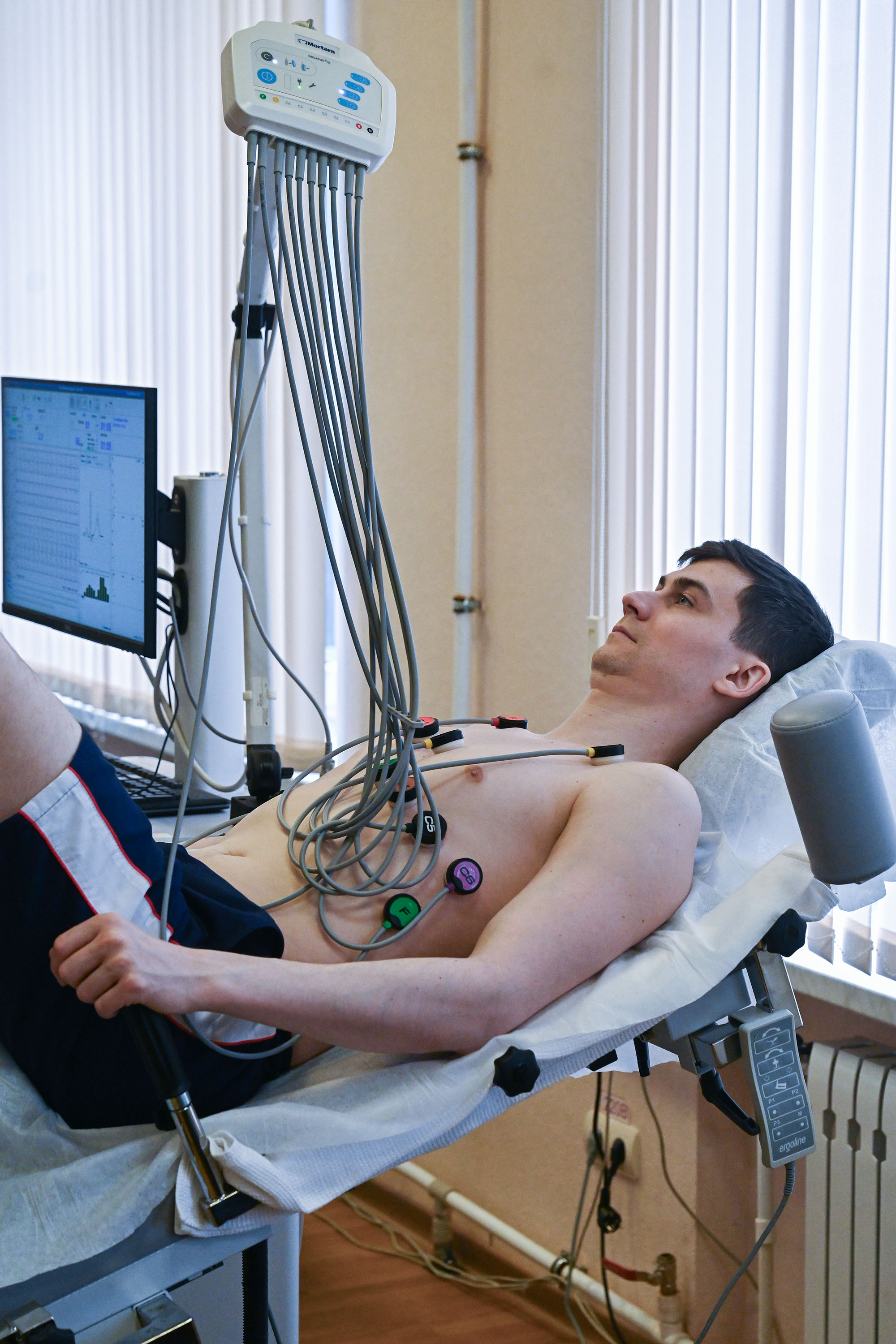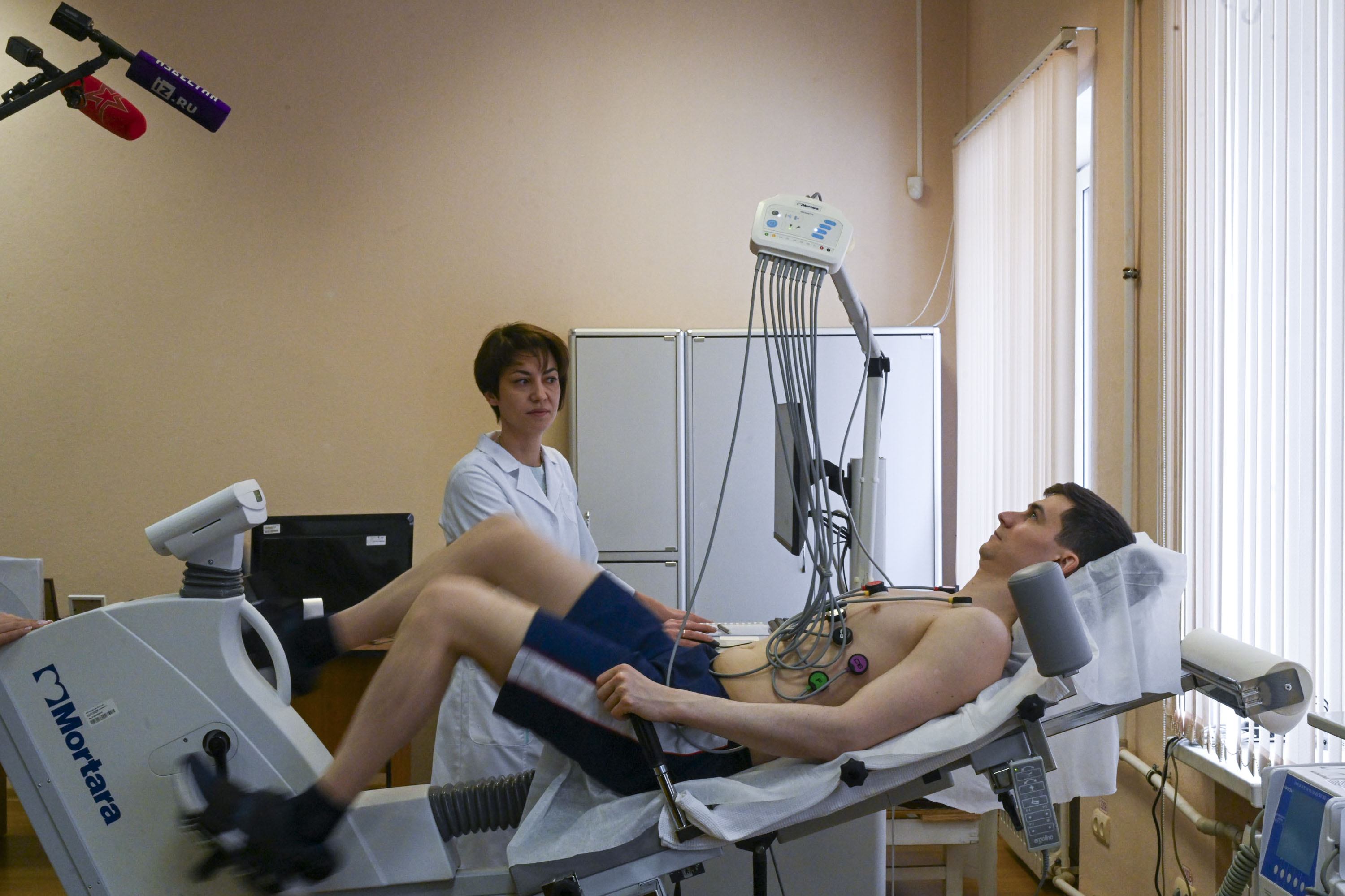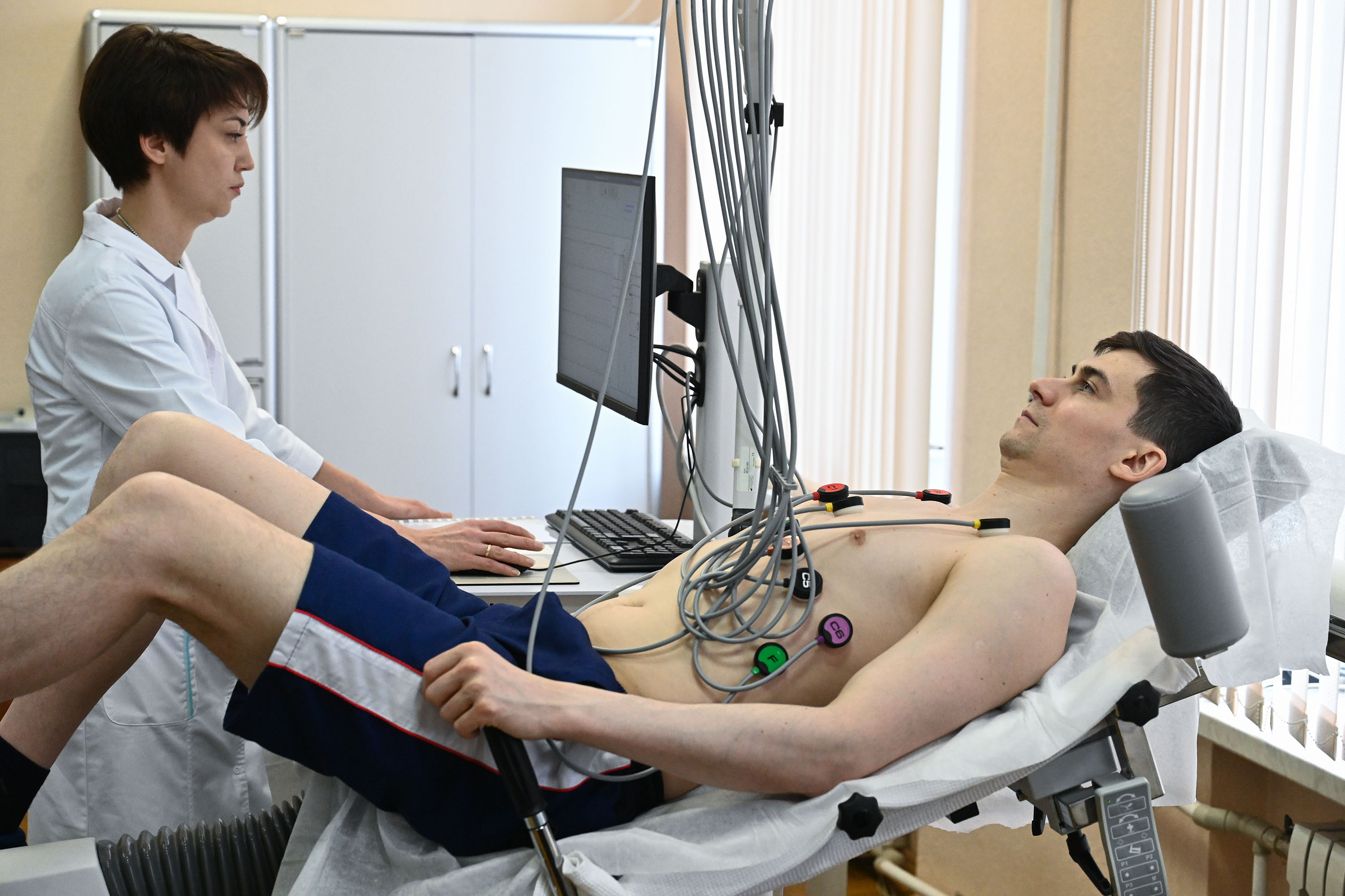 Врач функциональной диагностики ЦПК Наталия Власова рассказала журналистам о том, как происходит медицинское исследование на велоэргометре, а Алексей Зубрицкий выступил в роли испытуемого.