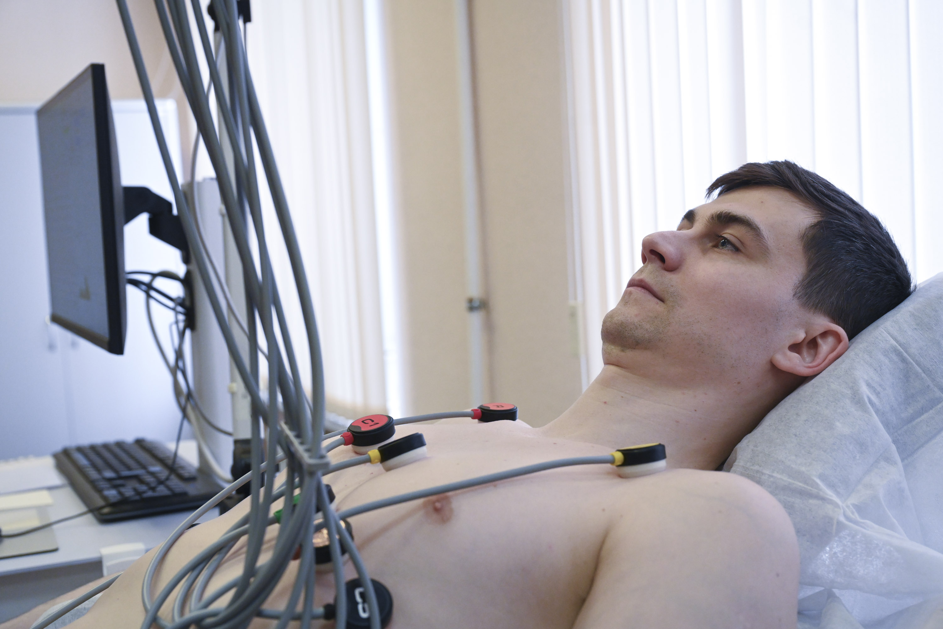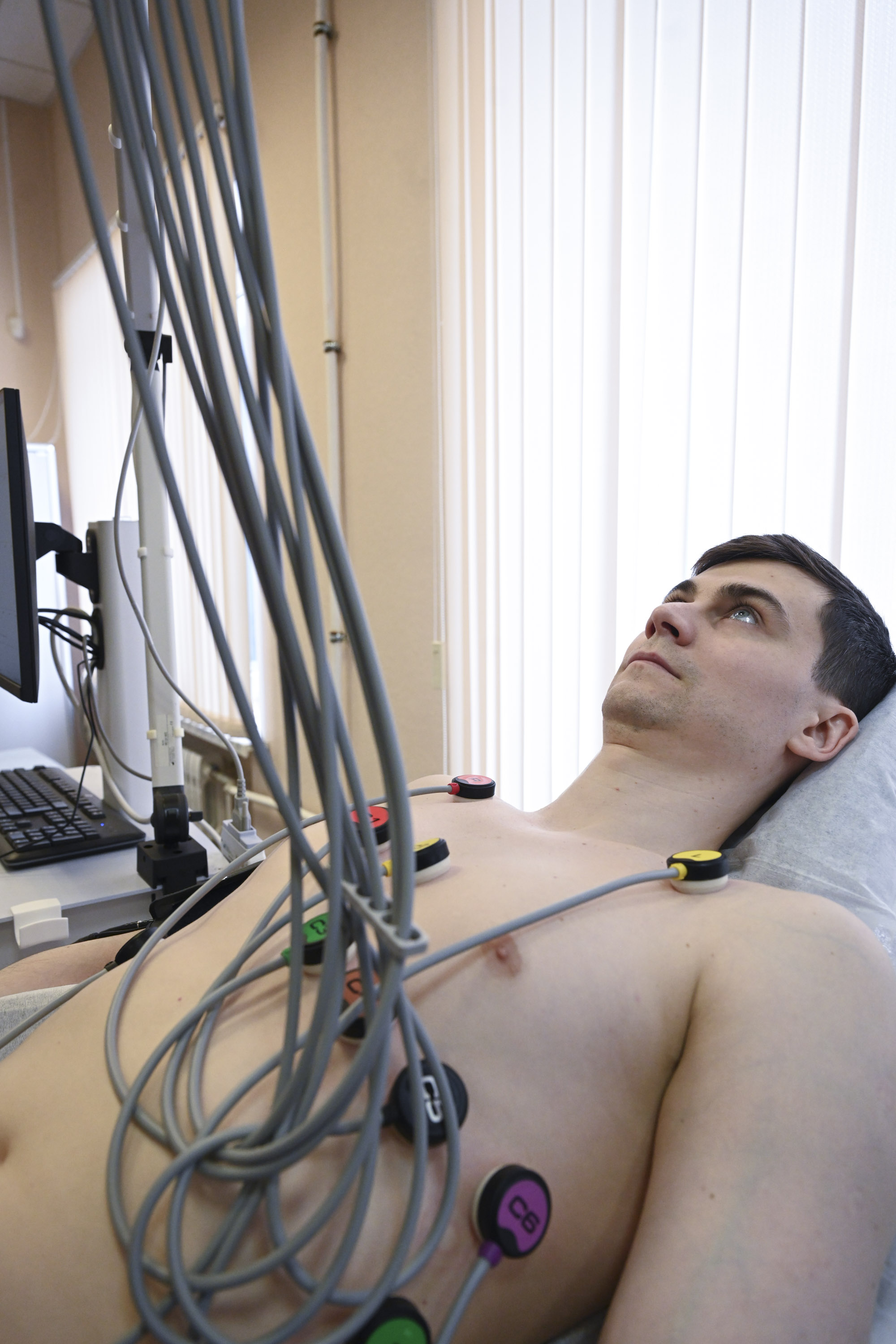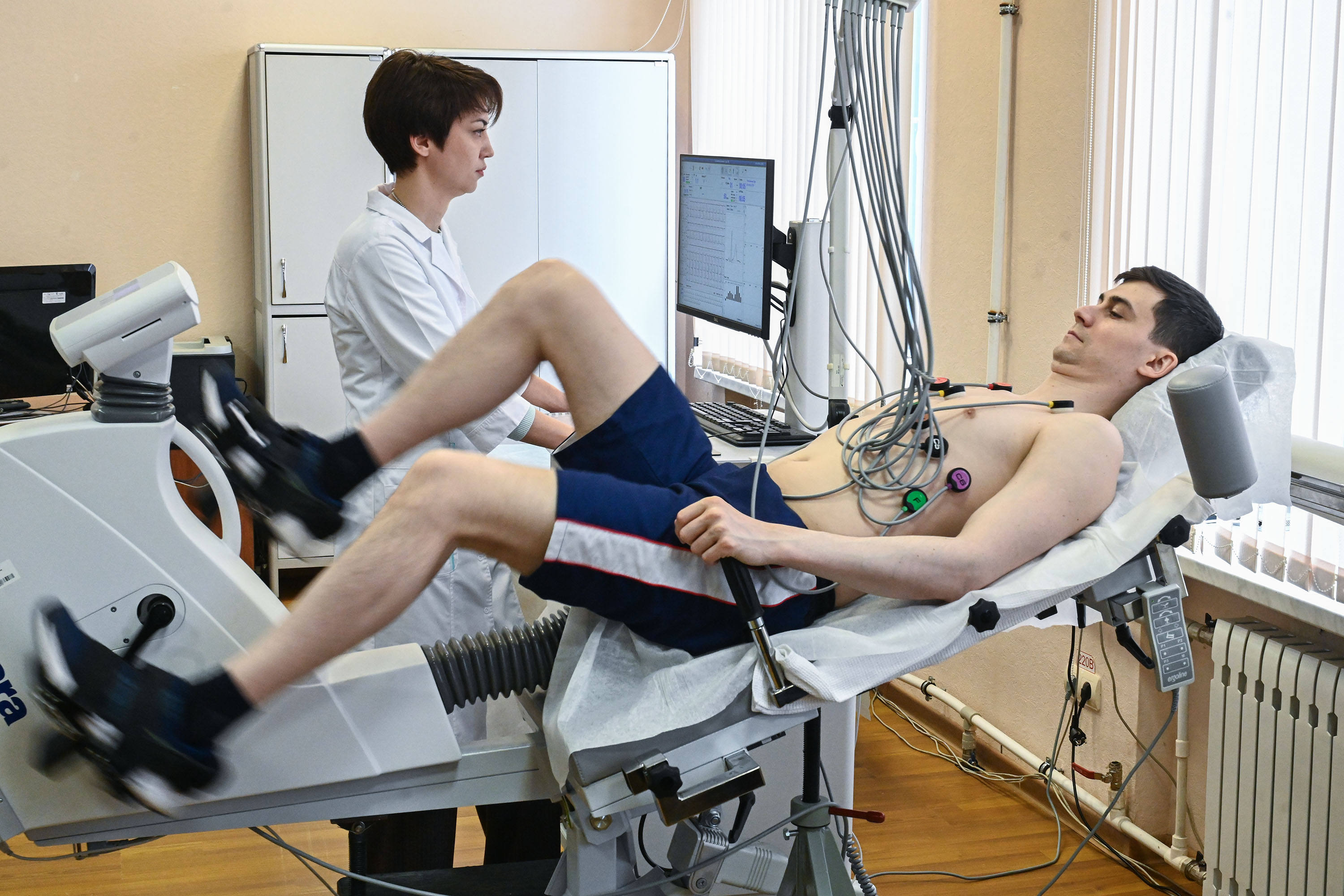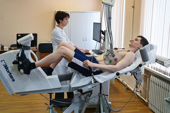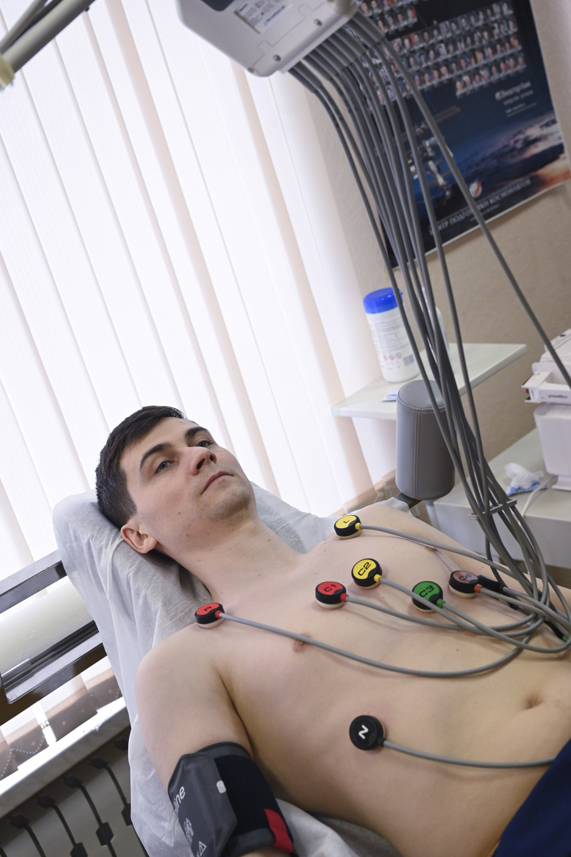 Врач функциональной диагностики ЦПК Наталия Власова рассказала журналистам о том, как происходит медицинское исследование на велоэргометре, а Алексей Зубрицкий выступил в роли испытуемого.