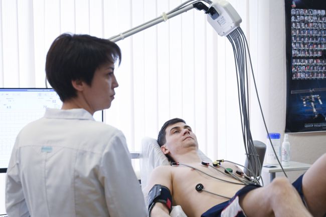 Далее представители СМИ посетили медицинское управление ЦПК, где специалисты Центра познакомили их с важными при отборе и подготовке тренажерами – креслом вестибулярных тренировок и велоэргометром.