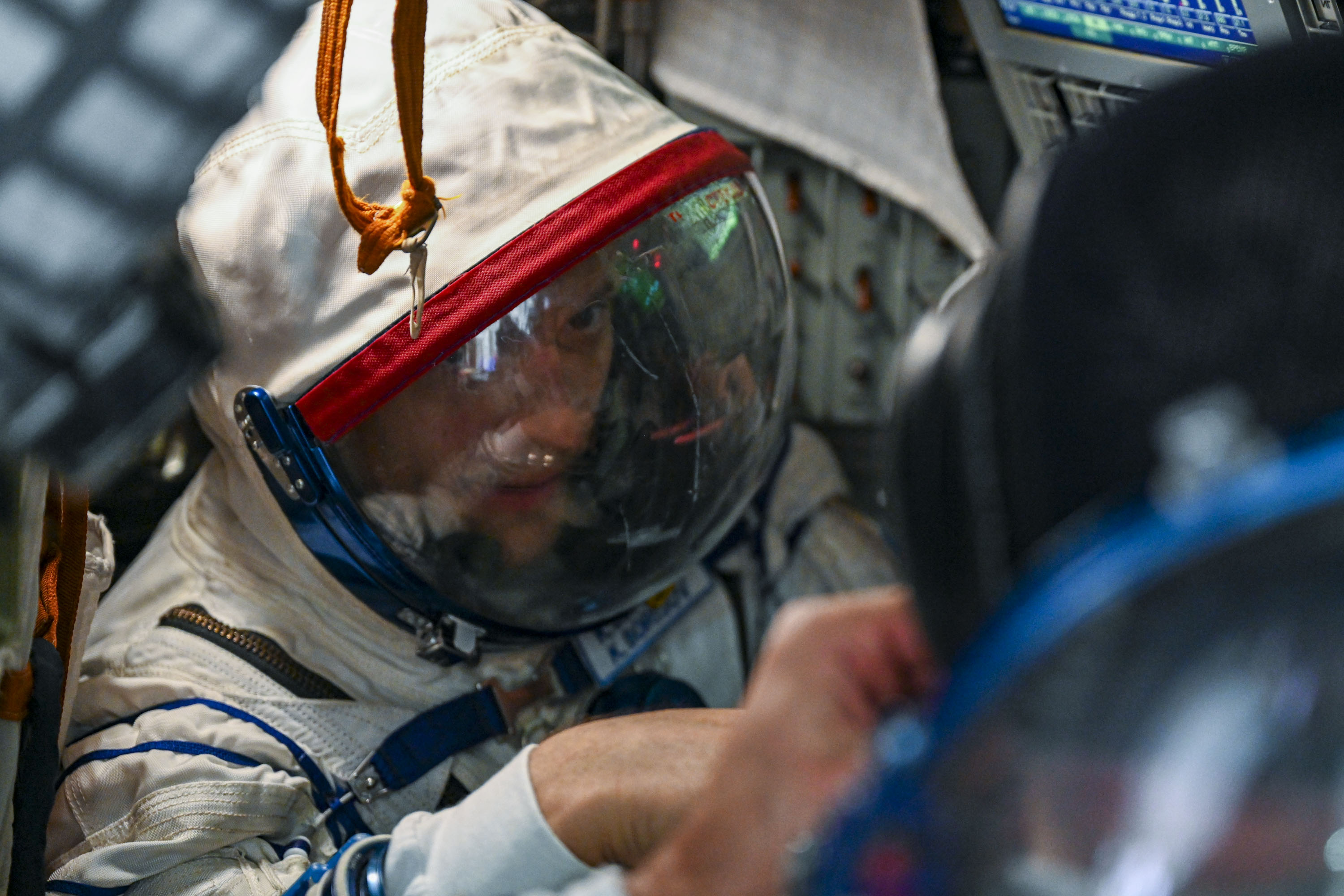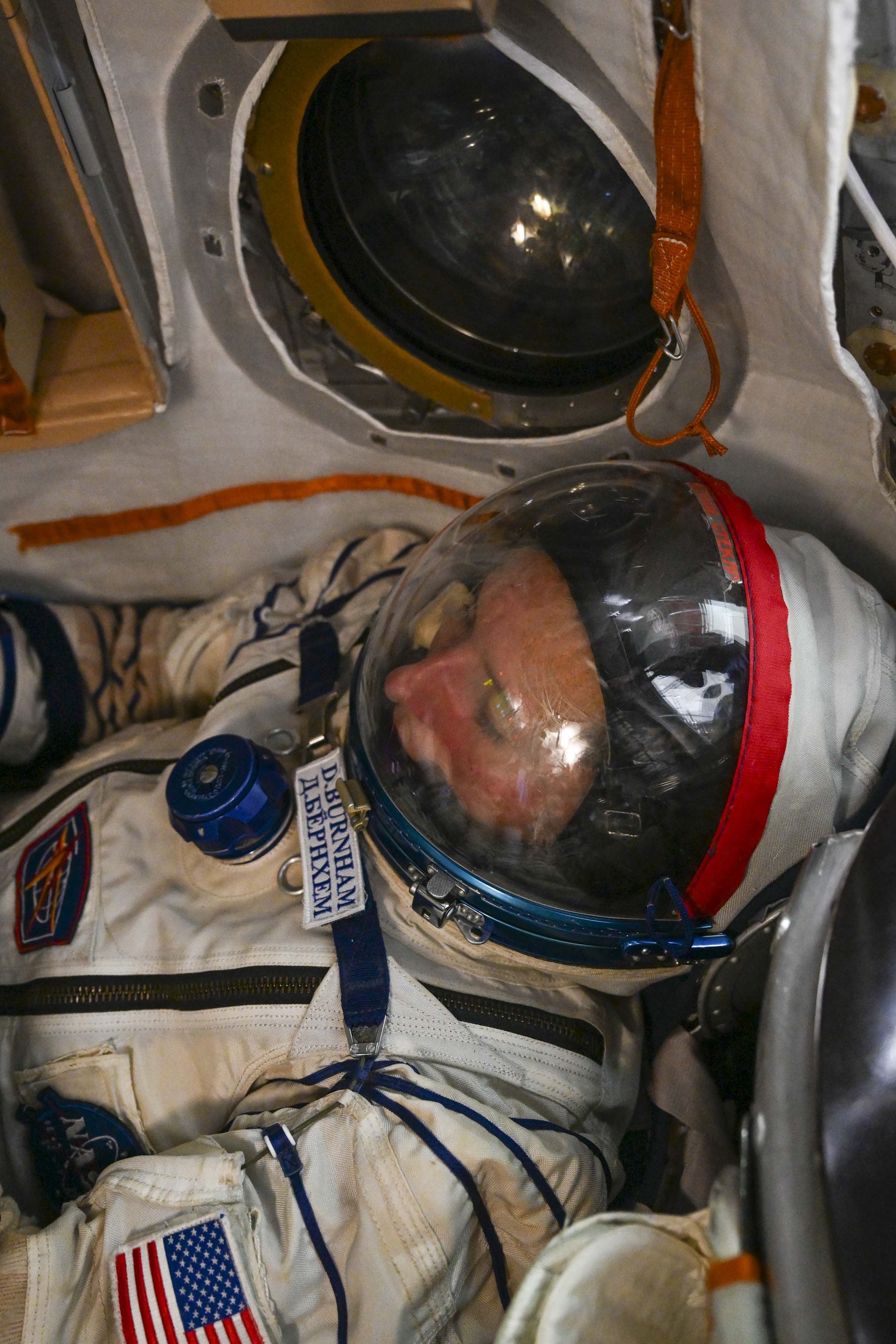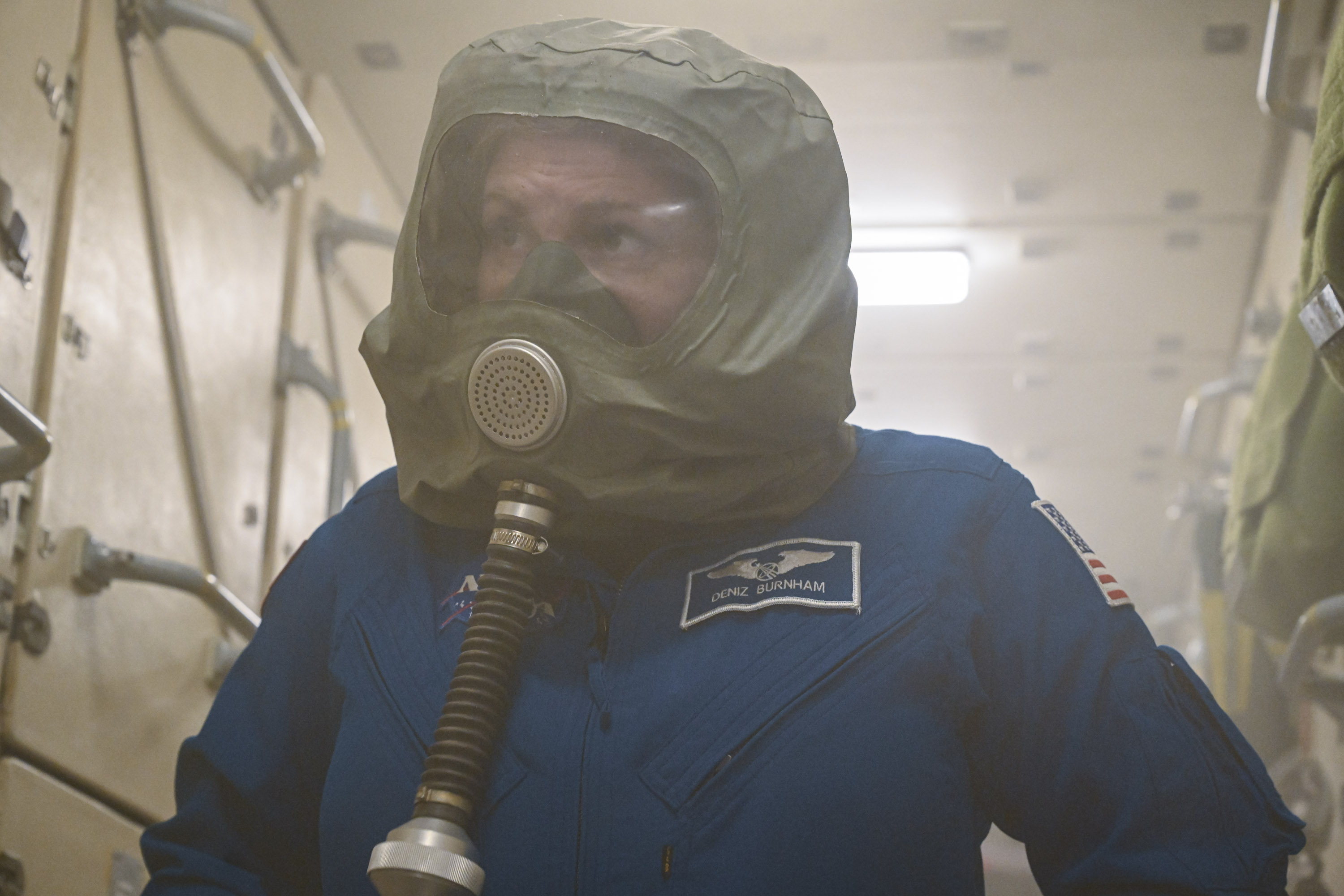 Эта часть комплексной тренировки проходит на тренажёре ТПК «Союз», куда перешли Дмитрий Петелин, Константин Борисов и Дениз Бёрнхем. Перед тем, как разгерметизировать корабль, экипаж надел скафандры, находясь в противогазах. Инструкторы обращают внимание на правильность выполнения этой непростой процедуры.