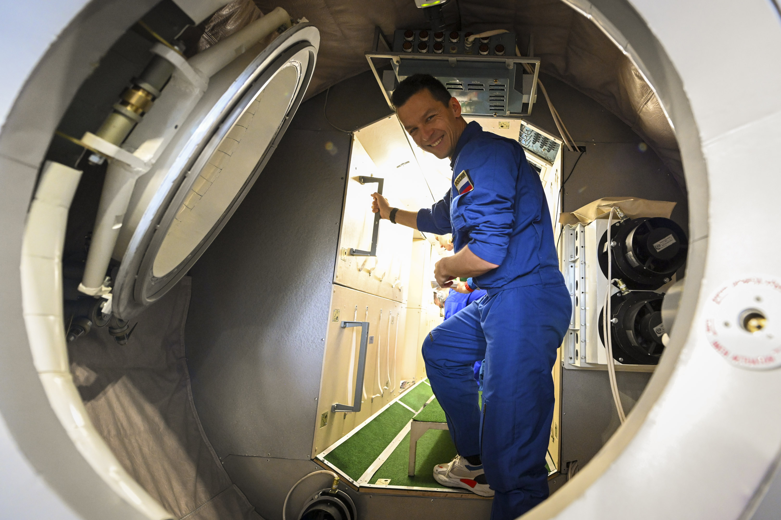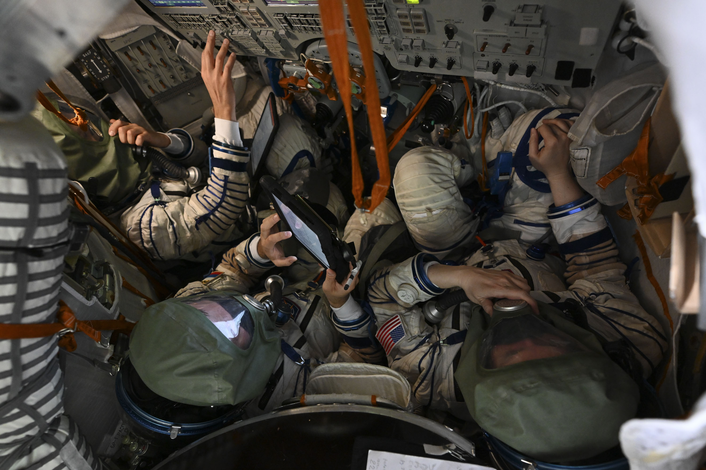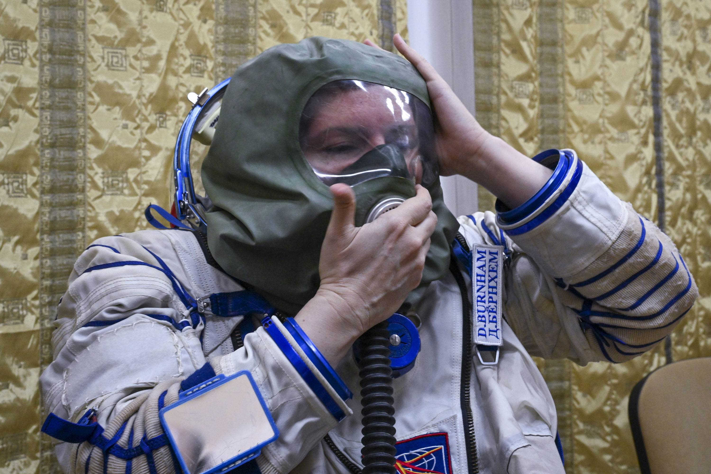Эта часть комплексной тренировки проходит на тренажёре ТПК «Союз», куда перешли Дмитрий Петелин, Константин Борисов и Дениз Бёрнхем. Перед тем, как разгерметизировать корабль, экипаж надел скафандры, находясь в противогазах. Инструкторы обращают внимание на правильность выполнения этой непростой процедуры.