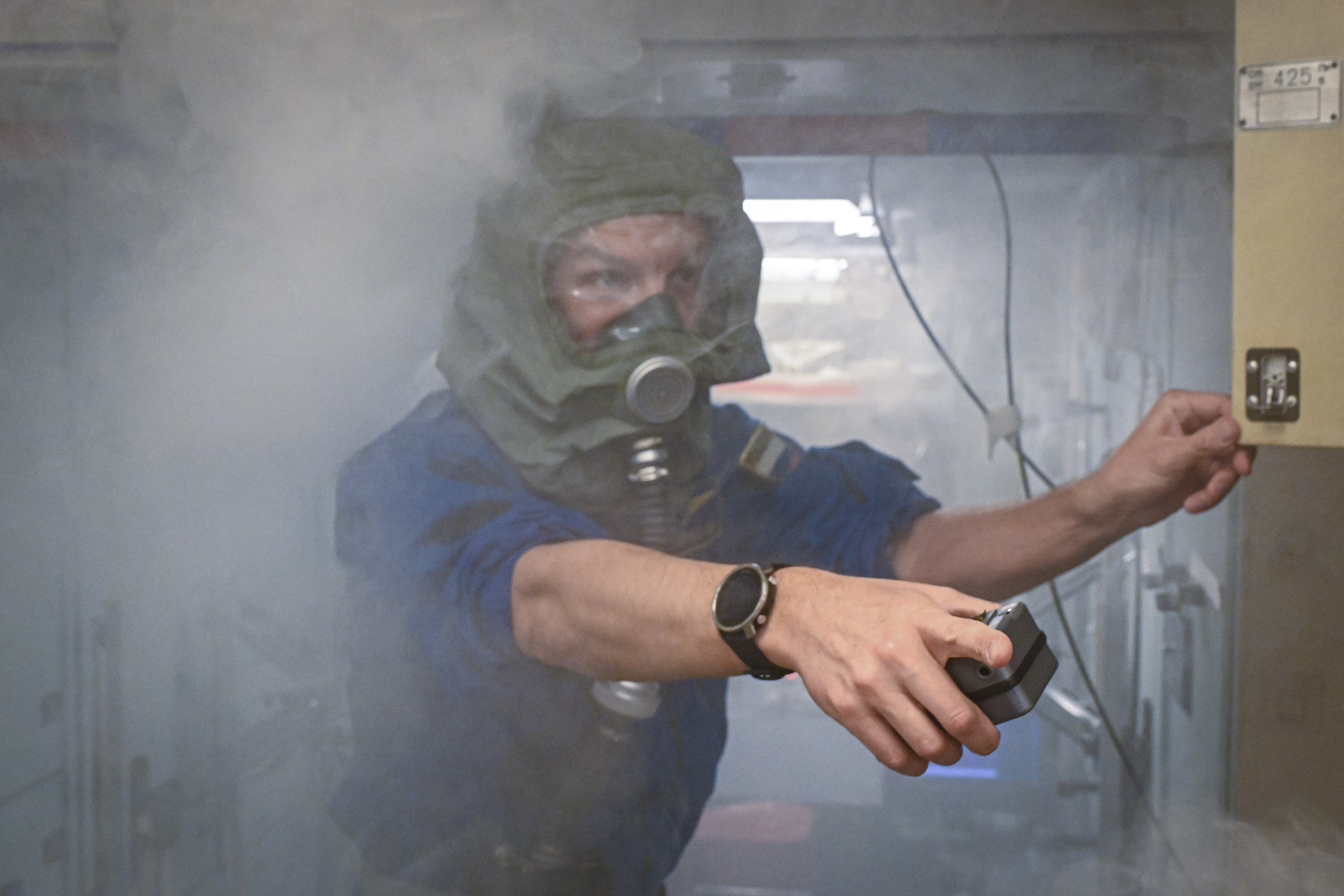 Также Дмитрий Петелин, Константин Борисов и Дениз Бёрнхем отработали алгоритм действий при пожарах. По одному из сценариев «огонь» возник в малом исследовательском модуле (МИМ-1) и, поскольку именно к этому модулю пристыкован корабль-спасатель, у экипажа не было иного выхода, кроме срочного спуска на «Землю».
