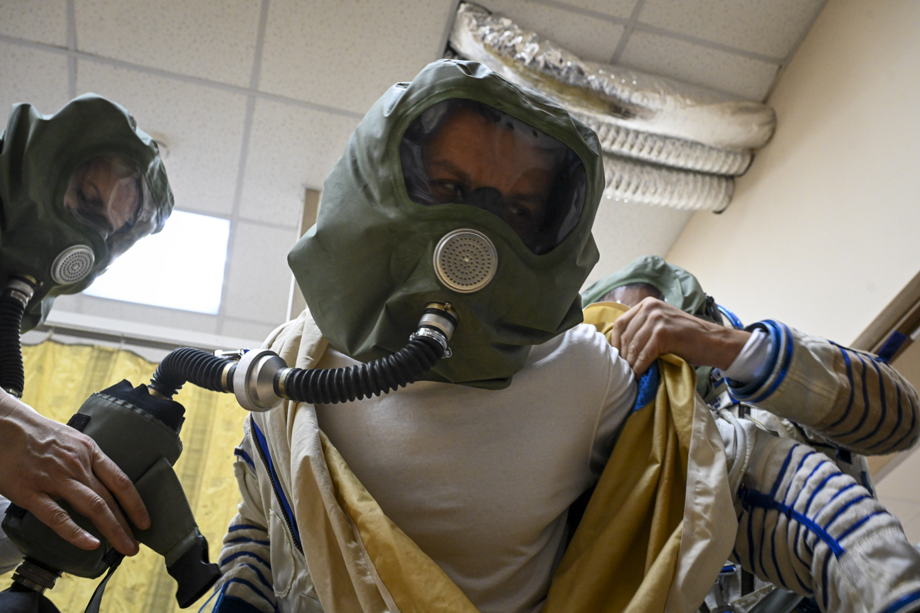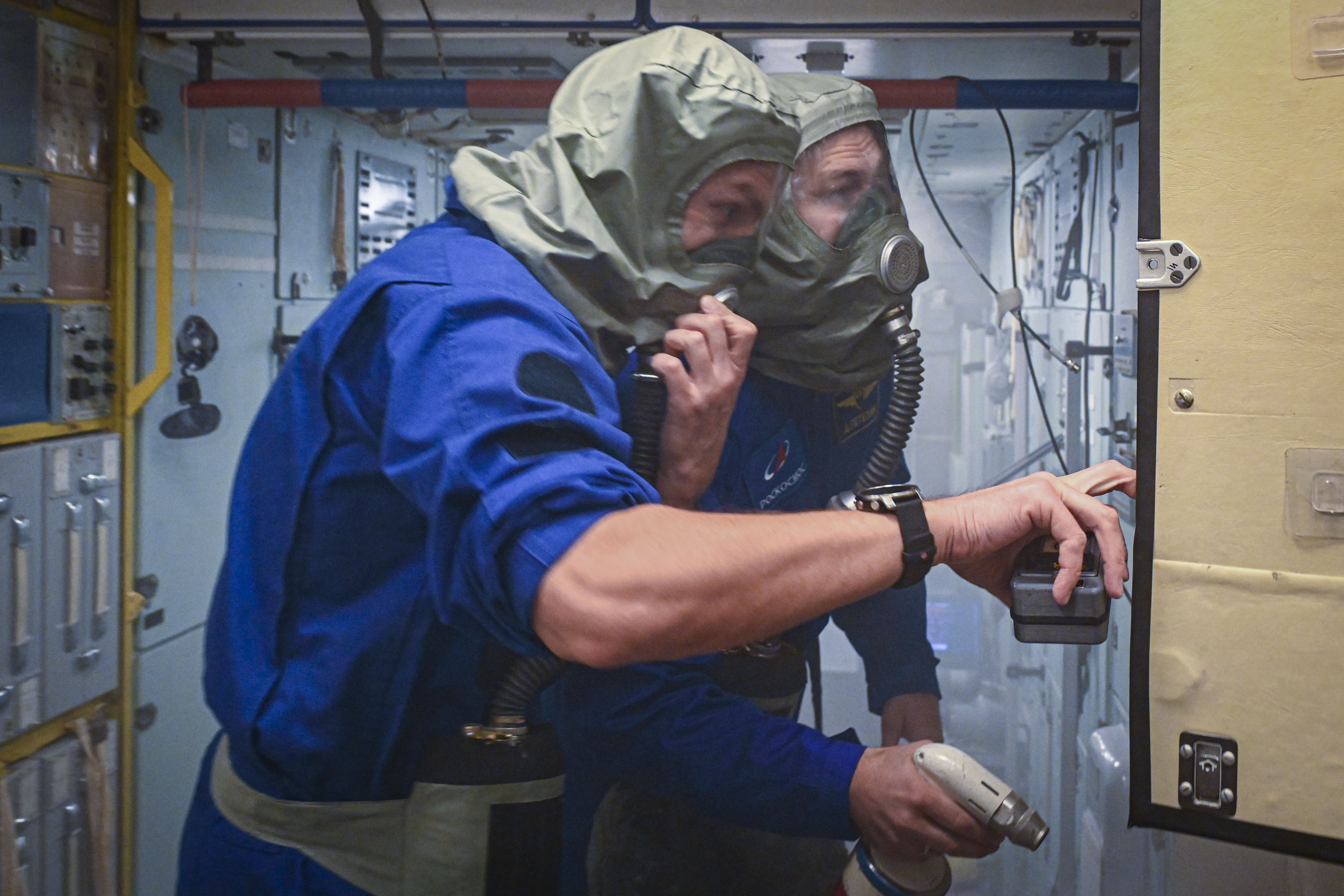 Поскольку продукты горения опасны для жизни человека, экипаж ещё на «станции» надел противогазы. Они рассчитаны на 20-40 минут работы. Есть ещё запасные средства индивидуальной защиты с тем же сроком действия.